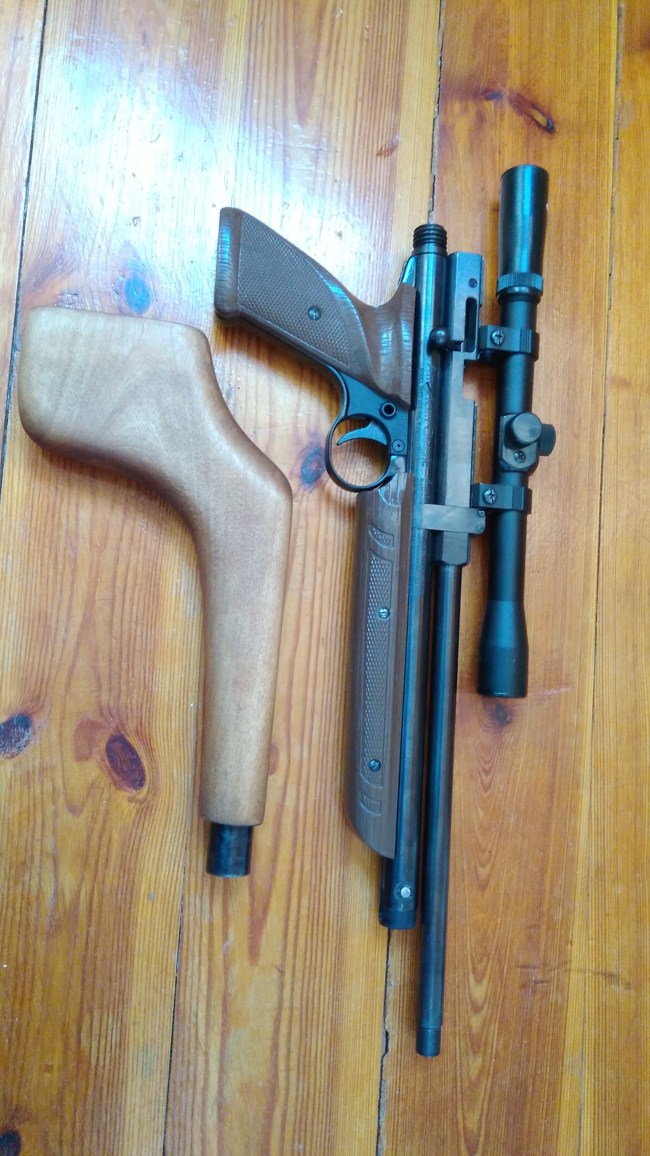 Crosman 1377 MK, полностью доработан, металлическая ствольная коробка, регулируемый поршень, трубчатый досылатель, задняя пробка с резьбой под съемный приклад, ствол от иж 38 с латунным лейнером с резьбой под модератор и правильными фасками, цельнофрезерованный рычаг накачки из подшипниковой стали. Цена 350р