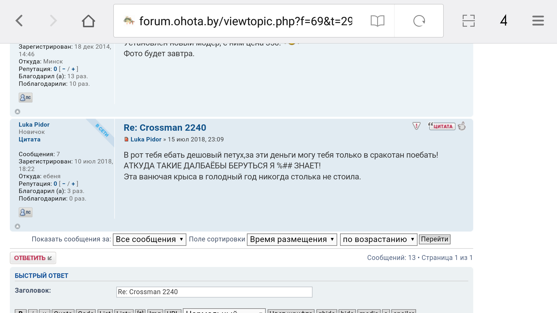 Да это тот же гнус Слава_У_ Краине и т.д. , если честно можно поставить его на место если найдутся желающие можно написать коллективное заявление и он свой кожаный кинжал будет в другом месте сунуть , у меня таких скринов штук 10 есть , и при помощи администратора его айпи узнать нужным людям не проблема , был бы человек а статья найдется )