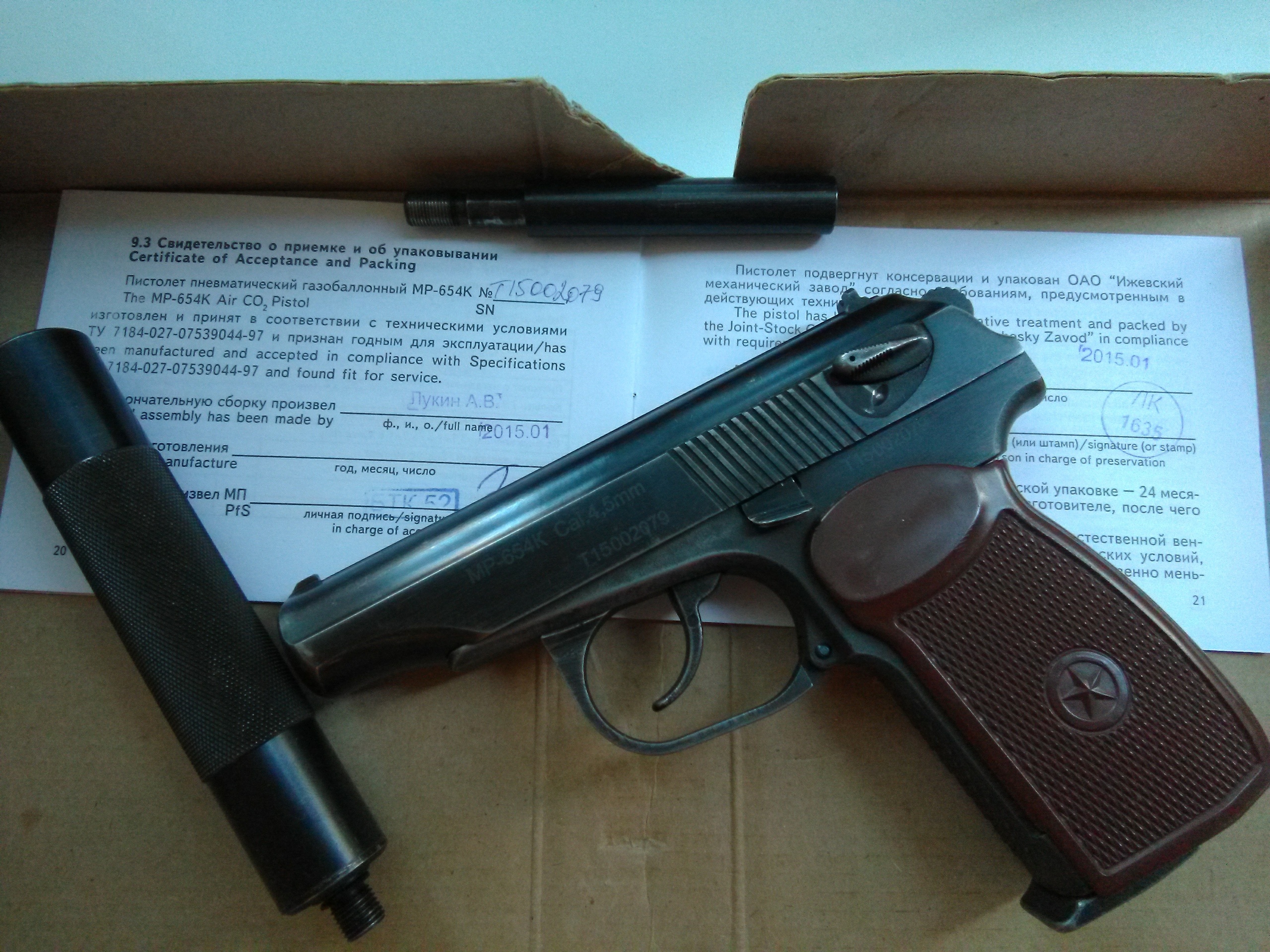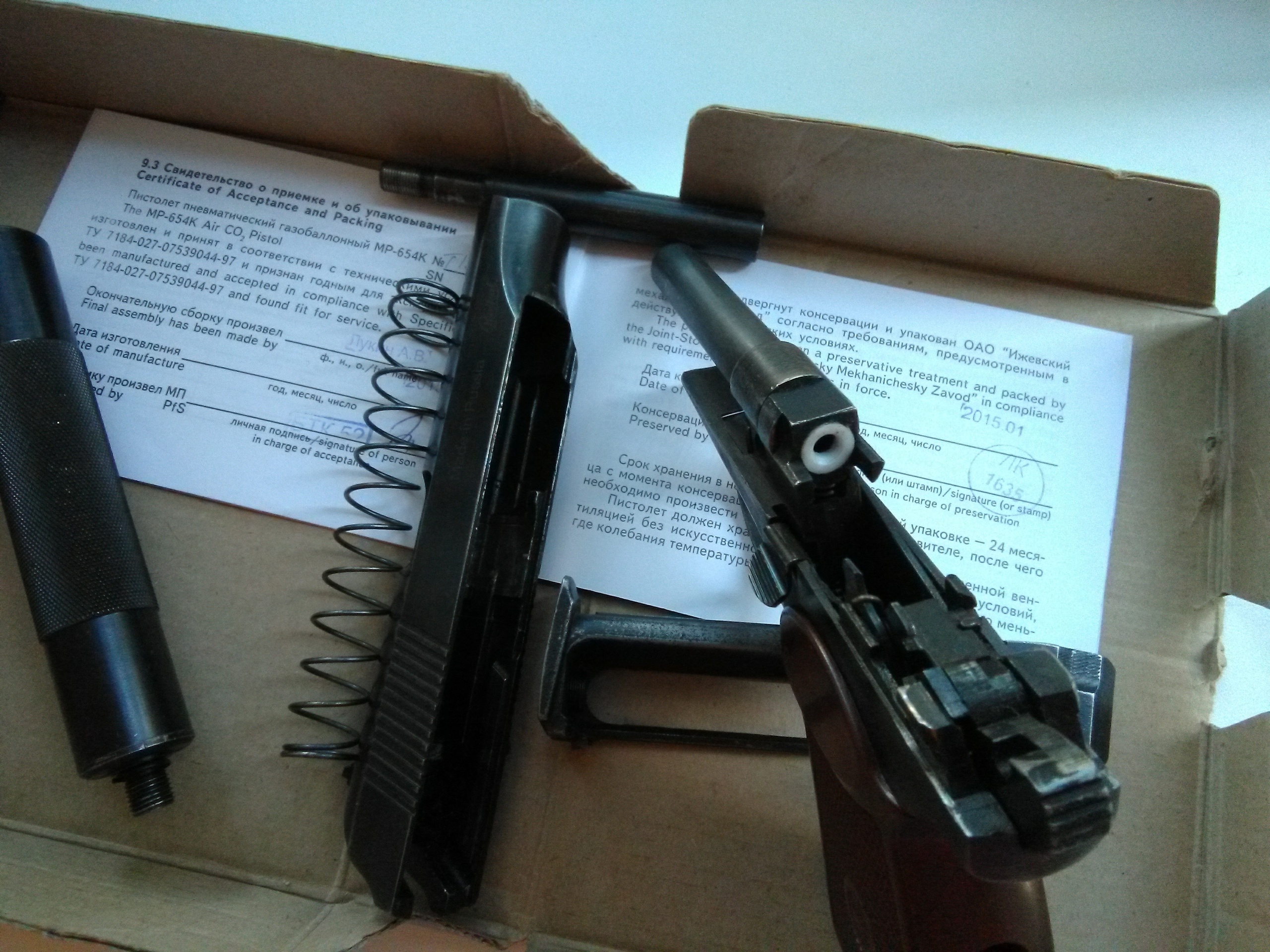 Продам безбородый МР-654К 2015г.в,паспорт и коробка в наличии.Курок без пропила,гайка ствола без зацепа,корпус клапана без паза.Установлен гладкий разборный удлинитель ствола от Петра с фторопластовой прокладкой.Родной нарезной ствол в комплекте.