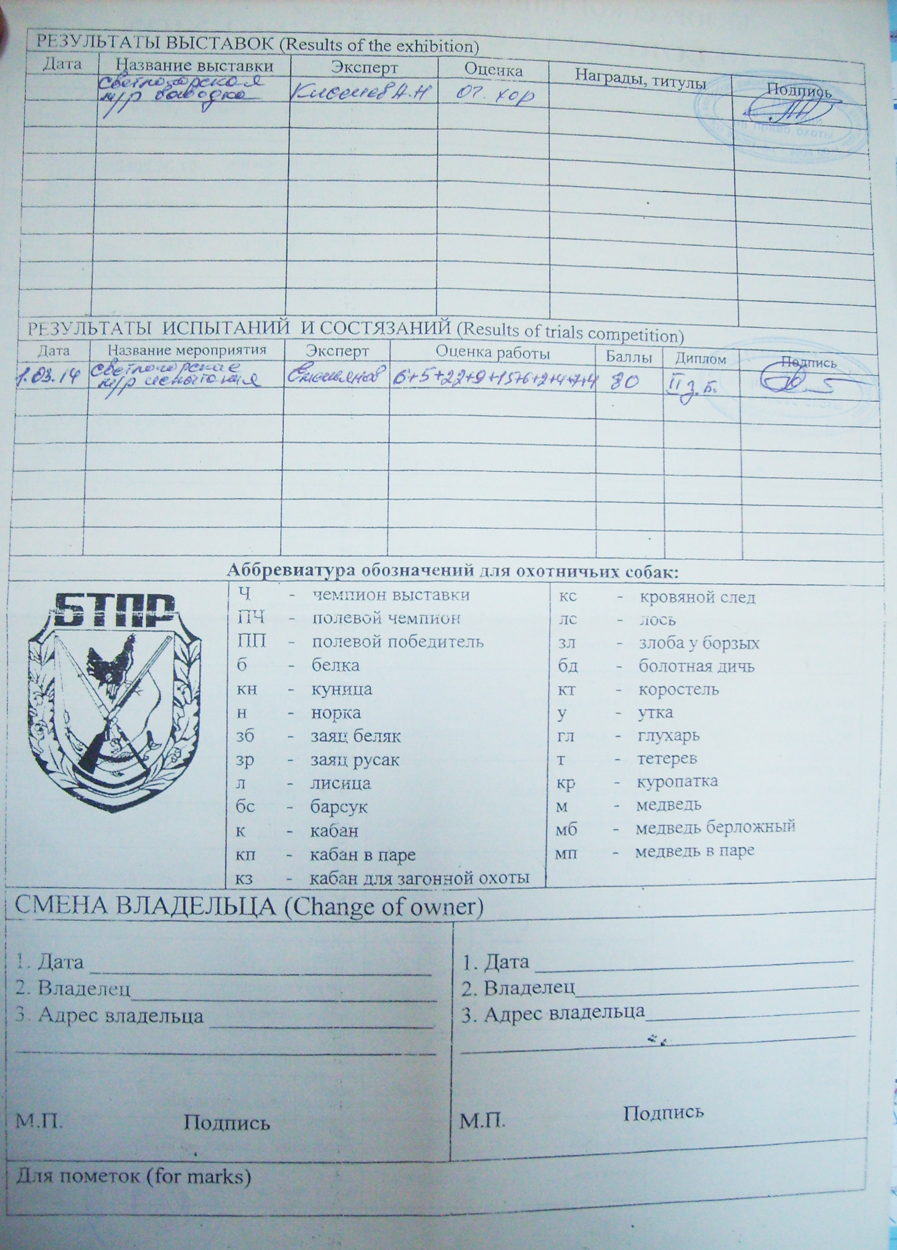При чем тут БКО? БКО только бумажки печатает. У нас одного такого самописца эксперта лишили пожизненно категории год назад... Вот смотрите, делают запись о работе на диплом, ставят филькину печать и едут в другую область оформлять помет... Естественно никто не проверяет наличие рапортичек, потому что единую базу никто не сделал... Все у потомков записи есть в родословной, а родители могли от ног не отходить.. Это все от БЕЗНАКАЗАННОСТИ!!! Причем если раньше с лисьими тройками мухлевали, то теперь уже до двух и первых заячьих добрались...