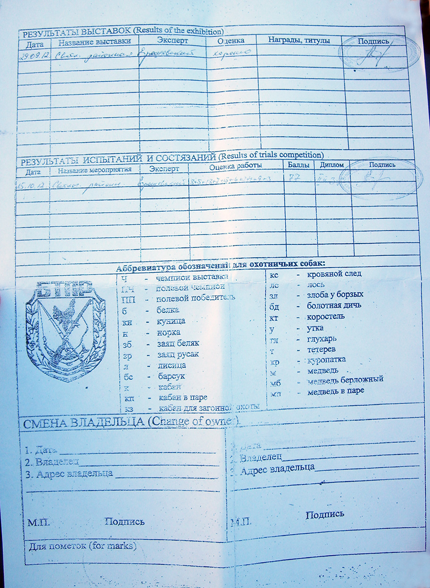 З.Ы. Алексей для этого и просят обе стороны выкладывать родословной, чтобы люди видели, что можно одной ручкой и одной рукой вписать оценку экстерьера и и расценку на испытаниях под разными фамилиями и ЗА ЭТО НИЧЕГО НЕ БУДЕТ... У НАС ЖЕ ВСЕ ЗАСЛУЖЕННЫЕ И ВСЕ МОЖНО!!! Печать вообще улыбнула... "ДЛЯ УДОСТОВЕРЕНИЙ НА ПРАВО ОХОТЫ" Даже такой откровенной липы никто не стесняется!!!!