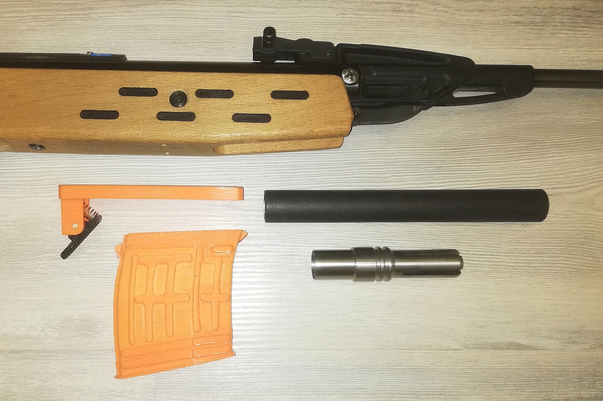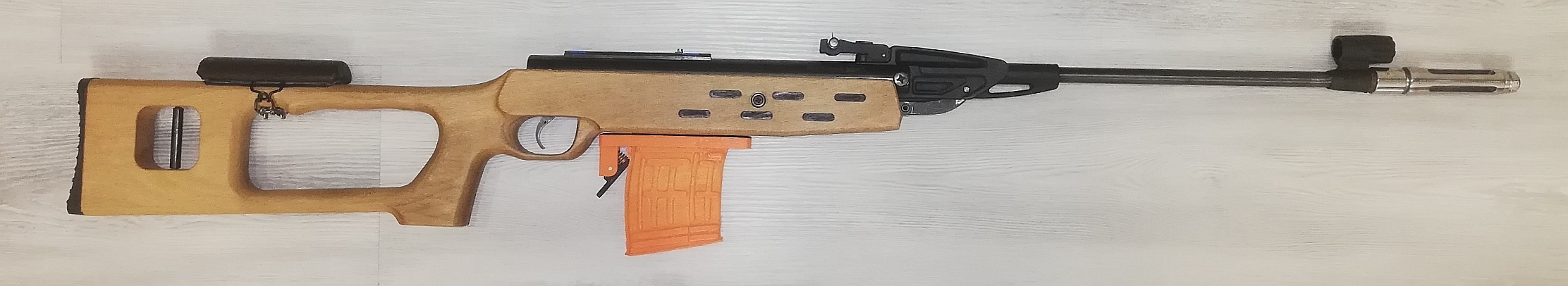 Стоит ГП, спуск доработан и мягок, внутри тоже все хорошо, два надульника и простой модер. Магазин используется, как контейнер для пуль. Отъемный, под покраску. Льняное масло для обработки ложа. Стилизована под СВД. Настрел небольшой исключительно для пристрелки. Хорошая точность.