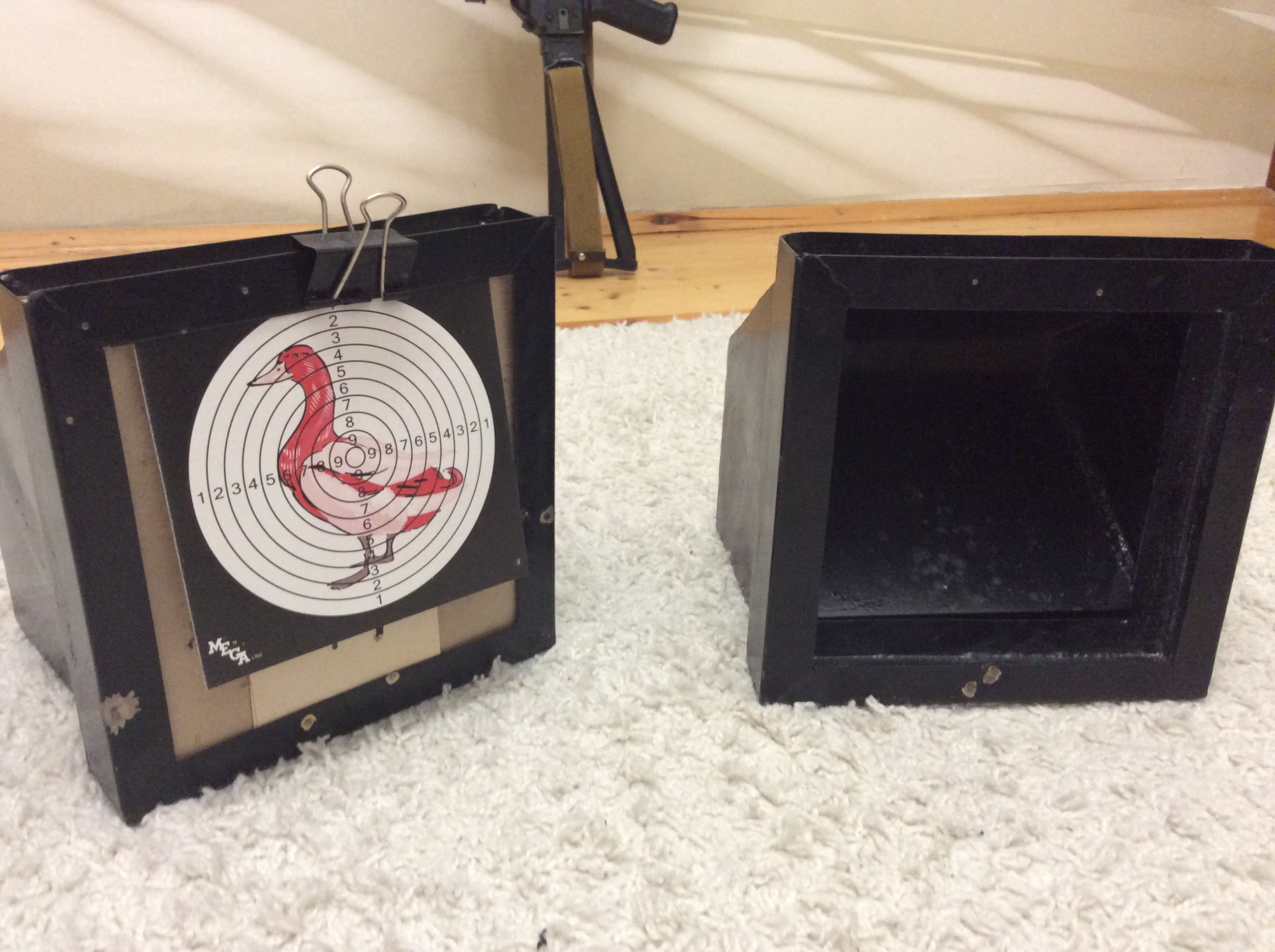 Между нижней наклонной и задней вертикальной стенкой есть зазор в который попадают стреляные пульки и