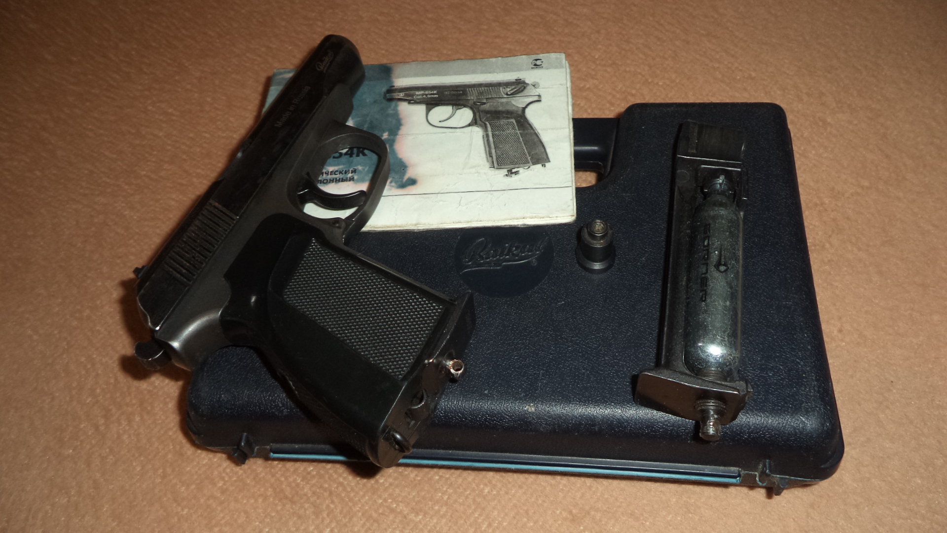 Пневматический МР 654 К 03. Год выпуска 00. Рукоятка черный бакелит от ПММ. Пестик в стоке . Прокладка ствола есть, борода с срезом, ствол длинный. Передергивается легко без особых усилий , магазин с зацепом. Пистолет продается в пластиковом кейсе фирменном "Байкал". Есть вторая обойма , некомплектная нет штока накопителя по которому ударяет курок.Есть переходник ( обтюратор) для 7-8 гр. баллончиков. Цена комплекта 180 рублей. Сморгонь 80336863322 МТС.