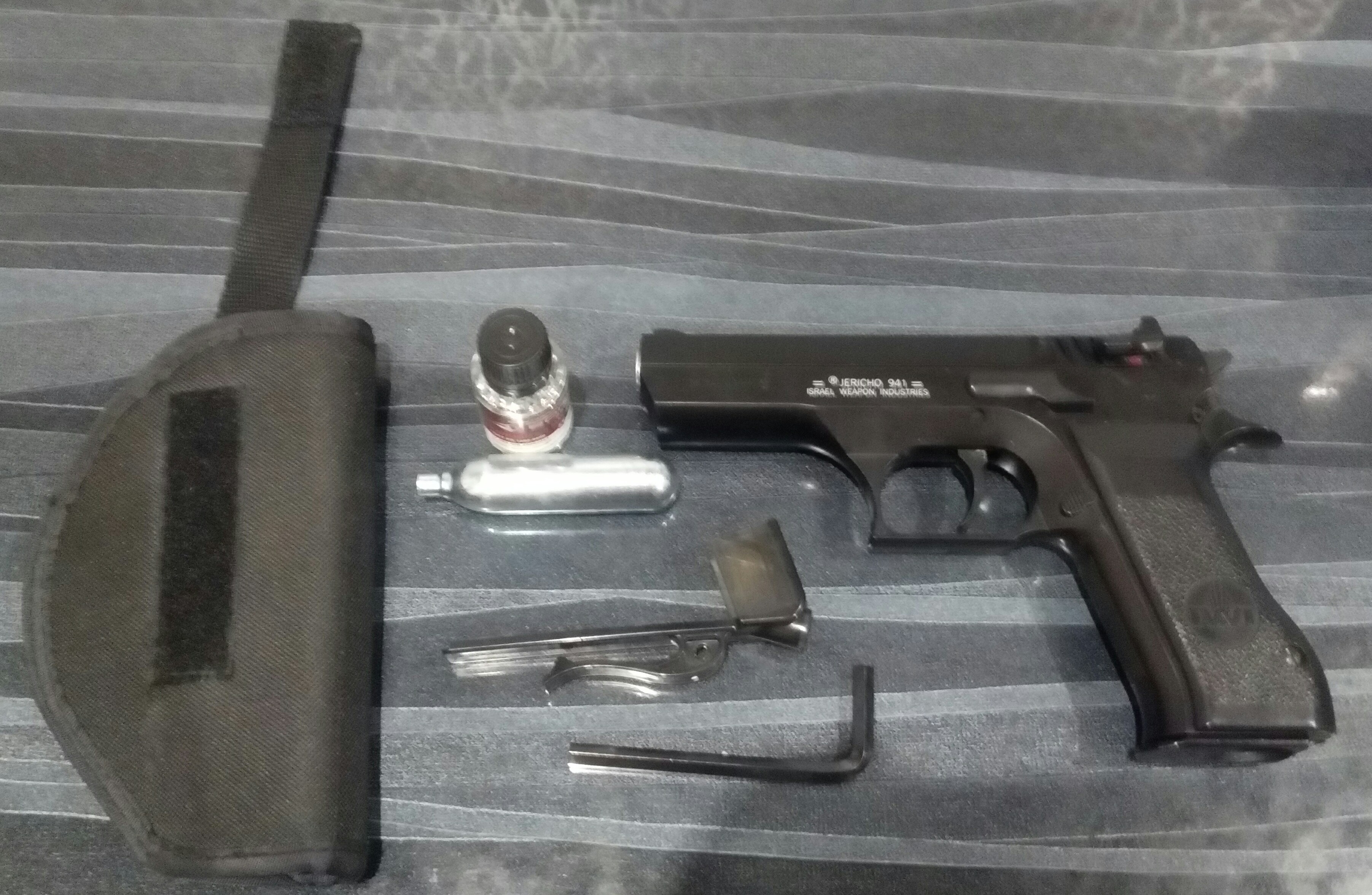 В комплекте: оригинальная упаковка(коробка),пистолет с обоймой,остаток стальных шариков ВВ,ключ поджима баллончика,спидлоадер для снаряжения обоймы шариками,баллончик СО² и поясная кобура-идеально ложится в неё пистолет и отлично фиксируется в ней.