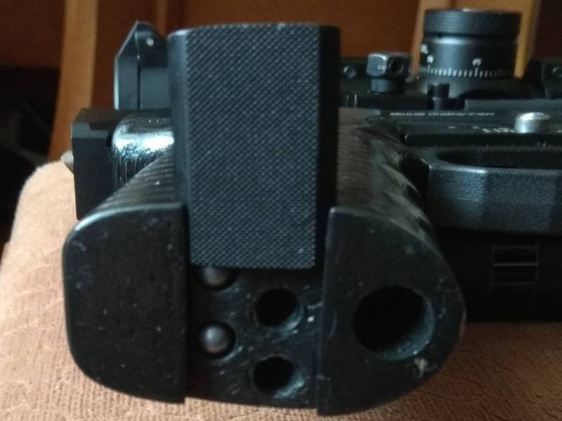 Приклад родной но к нему приделан тыльник от Magpul CTR- сидит четко, жестко и удобно (остаток трубы сверху плечевого, чутка помогает компенсировать подброс). В комплекте приклад от Dimits