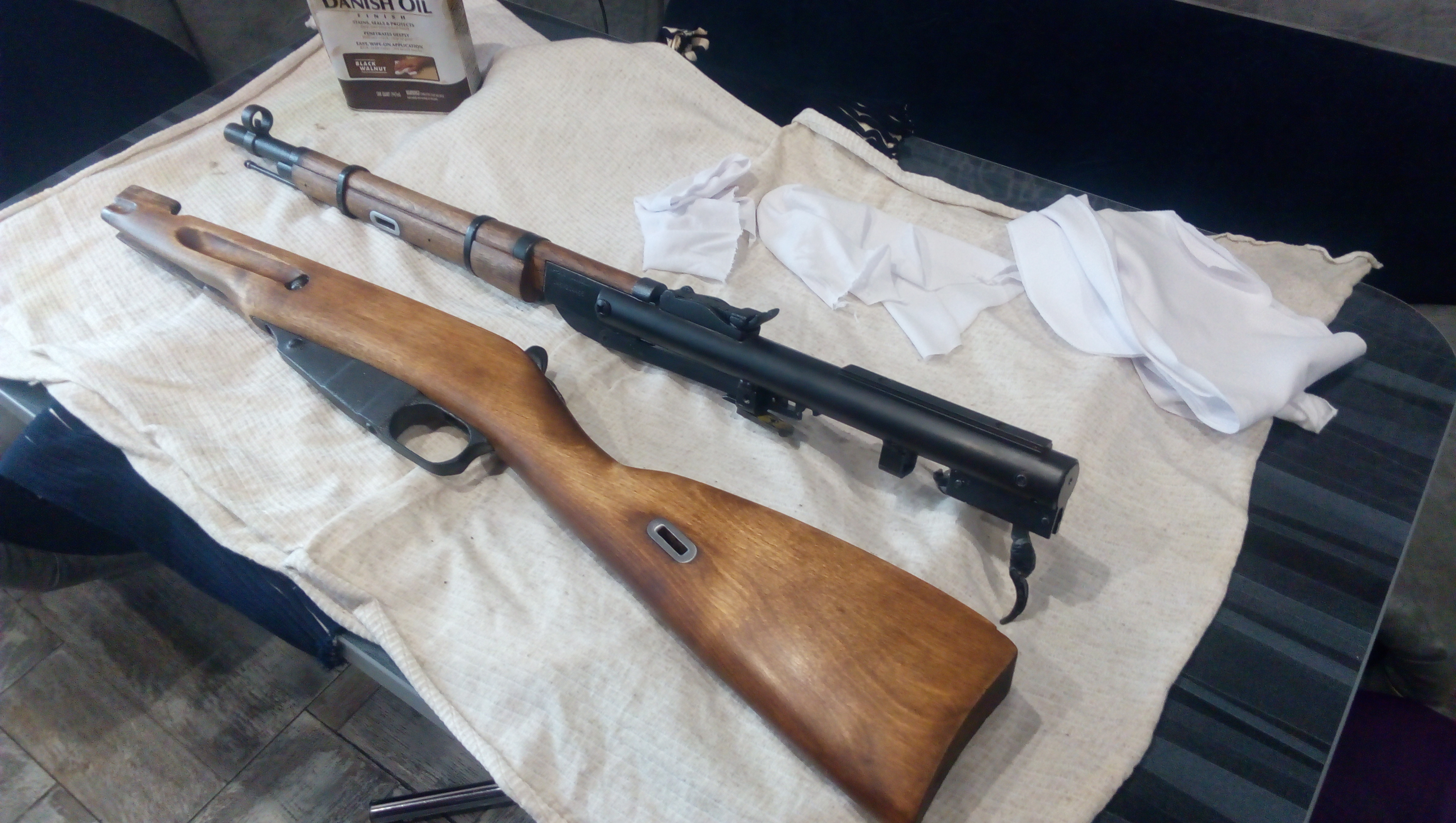 А вот и критика. Ну почему ты снимаешь старый окрас ложа?! Пусть даже потрепанный. Это же антуражно! Я даже металл не воронил на Мосинке, оставил местами даже ржавчинку.