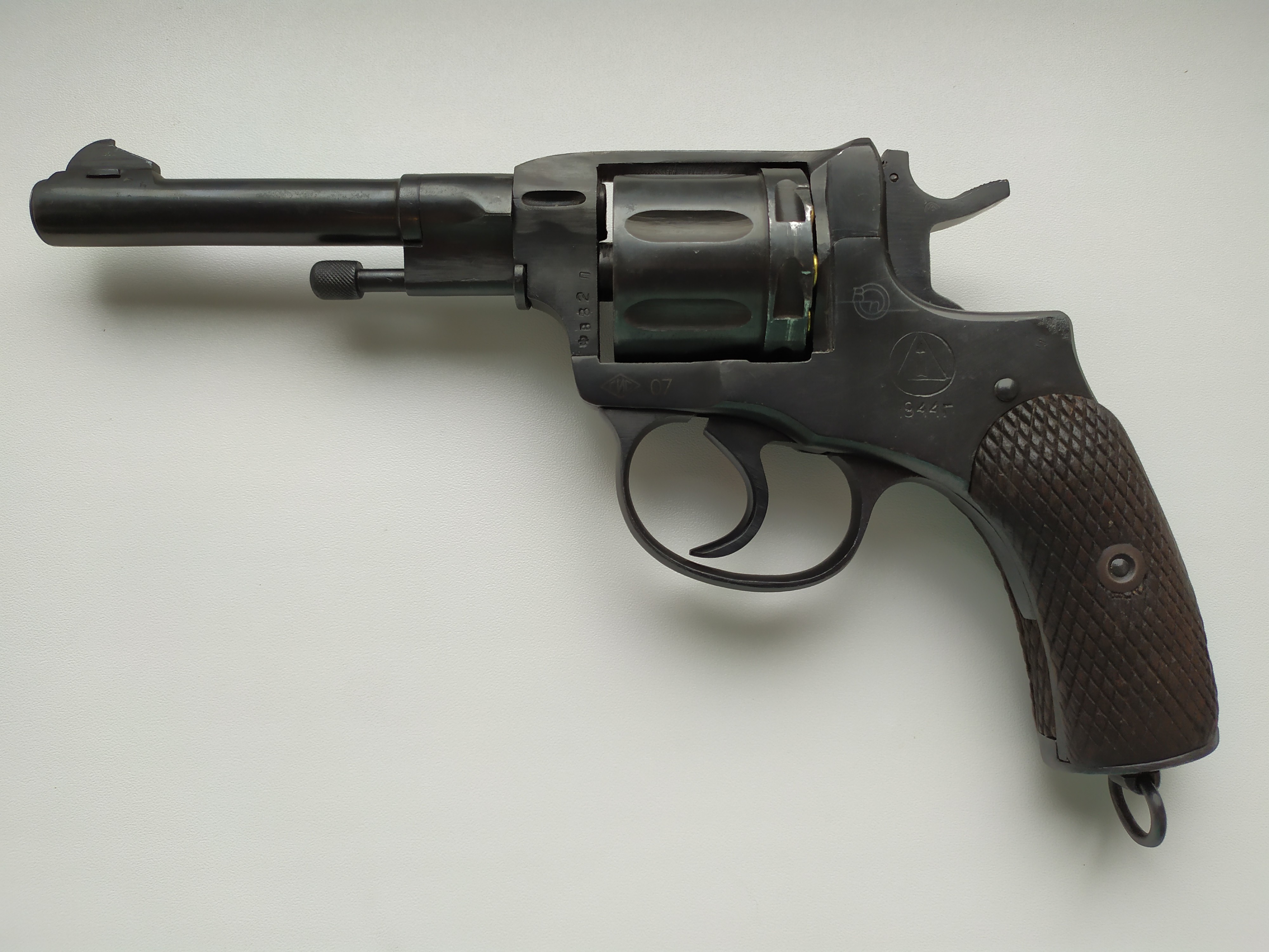 Всех с наступающим Рождеством! Продавцу успешной продажи! Наганы "у нас" не часто всплывают!. Не в ущерб к выставленному изделию, но крышка, скорее всего, менялась при войсковом ремонте. Все таки война, шла! Шрифты, по моему, на крышке, отличаются. На барабане, похожи с рамой. Не сколько не умоляю исторической ценности экземпляра!!! Да, еще и не глухой ствол! Это уже редкость в продажах. О том что крышка не "родная", а может и сама рама, с барабаном, показывают зазоры в стыках. На фотках, если приглядеться их можно видеть. Но ни кто на ВОЙНЕ на зазоры деталей внимания, конечно, не обращал! Главное, что бы стреляло! С большой степенью вероятности, можно сказать, что обозначенный экземпляр мог быть и в Берлине, у какого ни будь счастливого "летехи" (лейтенант) в День Победы. Кто знает!