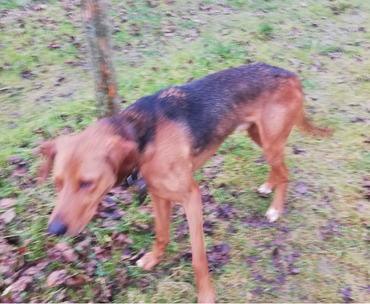 Найдена собака, предположительно русская гончая, кожаный коричневый ошейник, Воложинский район деревня Долевичи. Кобель очень худой. Подпалый.