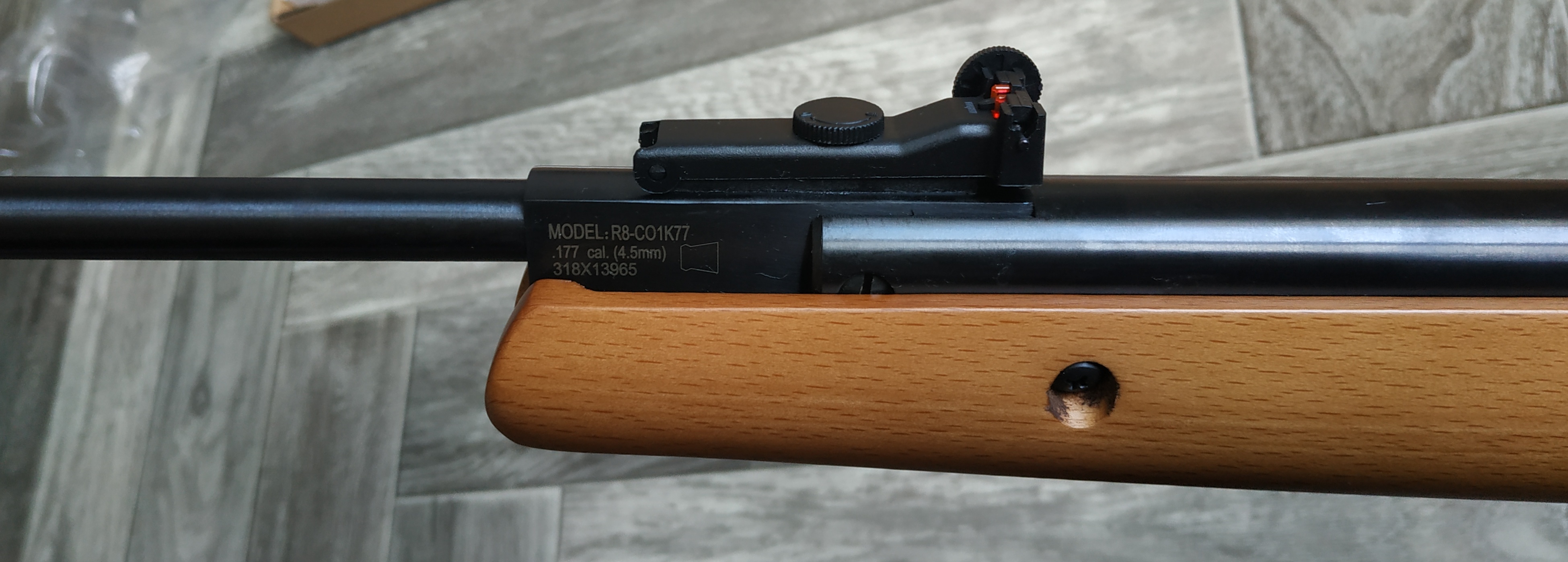 Деревянное ложе, металлическая муфта, легкий взвод, хороший спуск, предохранитель не автоматический, открытые прицельные, есть "ласточкин хвост" для установки оптики