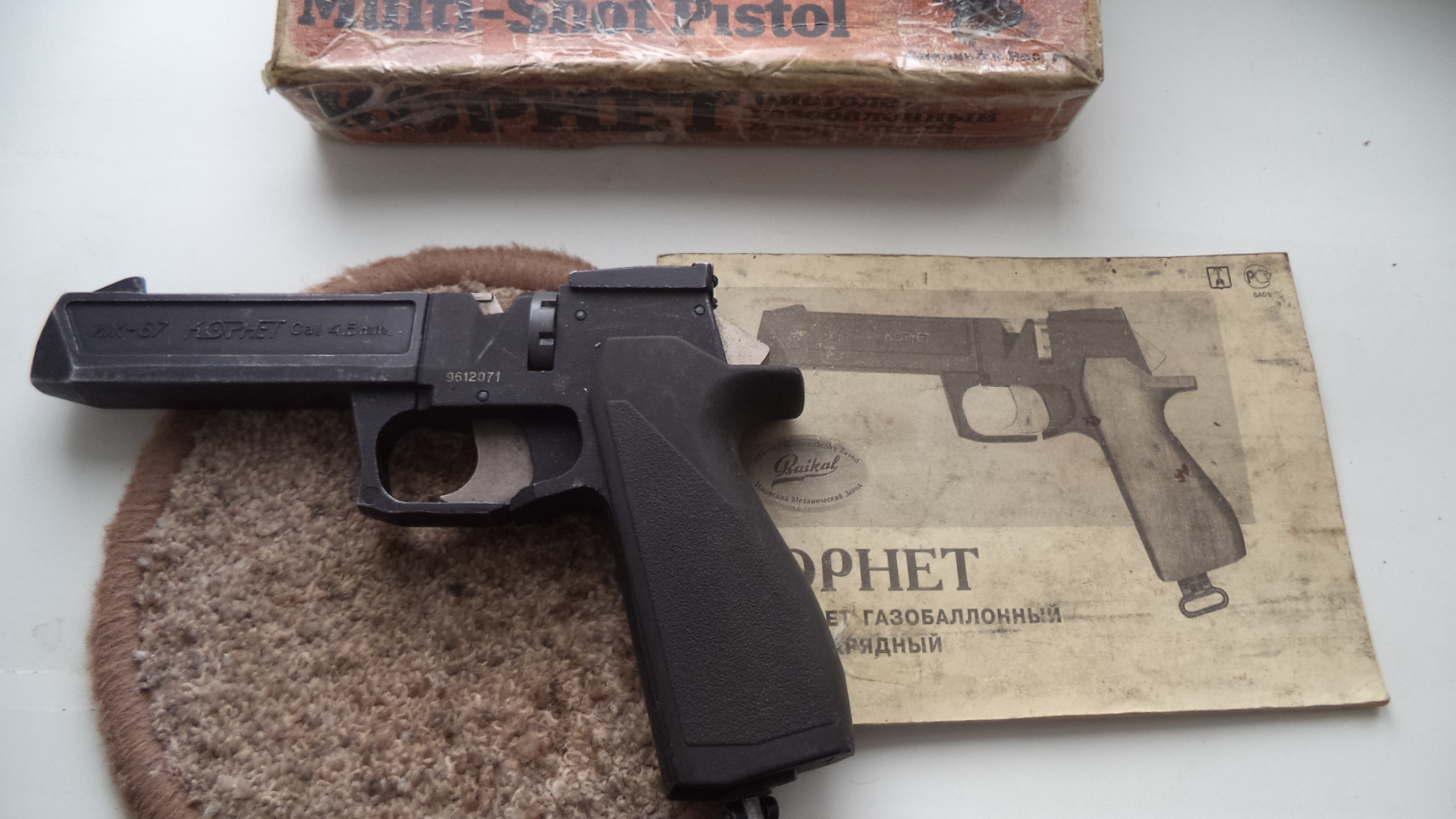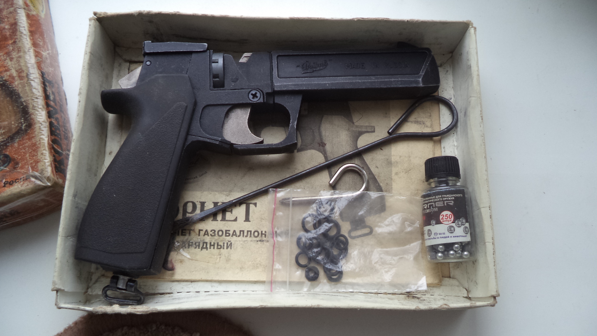 Комплект , пистолет, протирка, отвертка, резинки, документы, коробка , немного пуль. В стоке , при установке баллона травит. 100р. Чуть торг. СМОРГОНЬ. 80336863322 МТС.