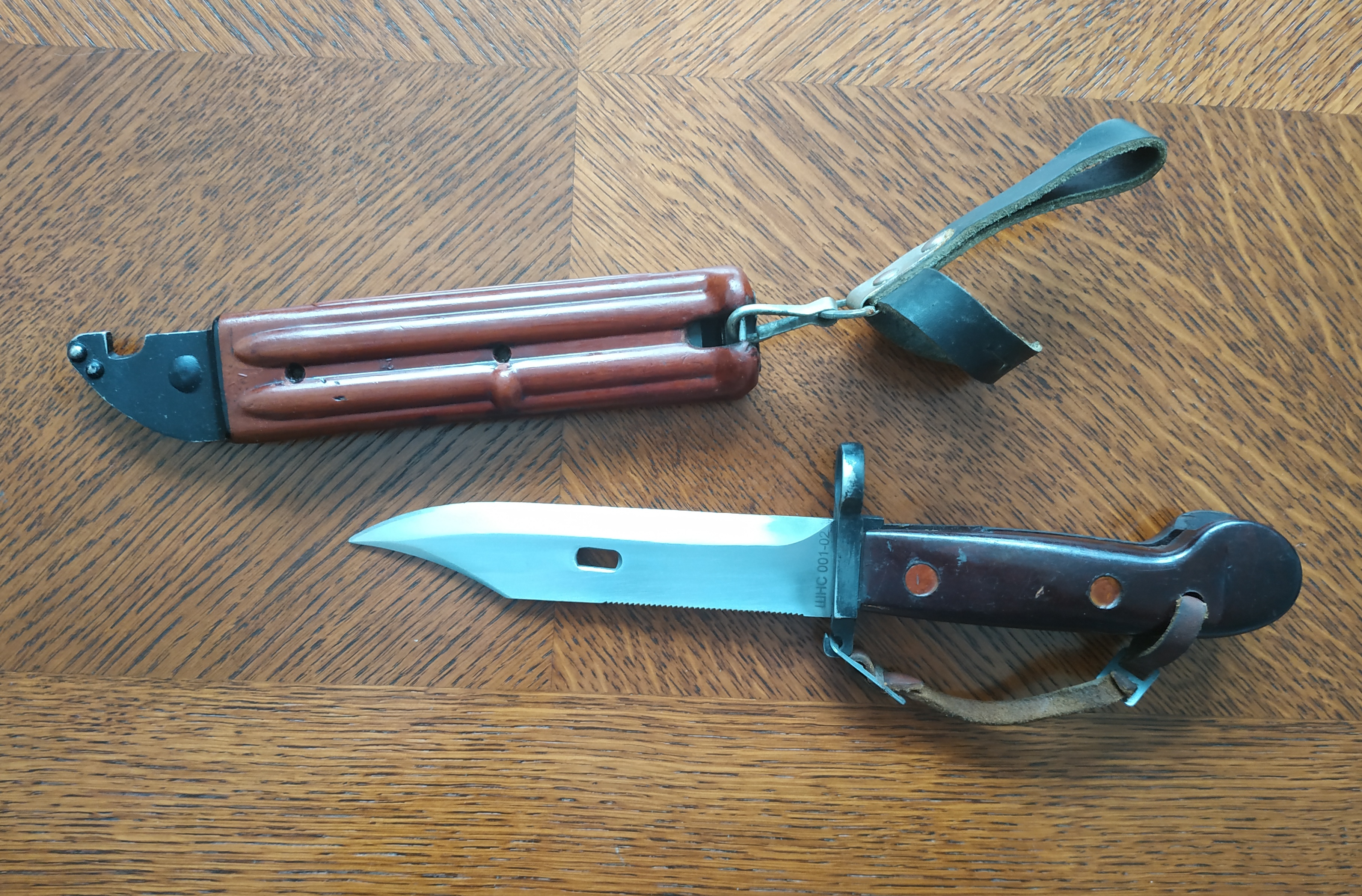 Модель ШНС-001-02 (переходной между АКМ и АК74), цельная коричневая рукоять бакелит, бакелитовые ножны, без пропила.