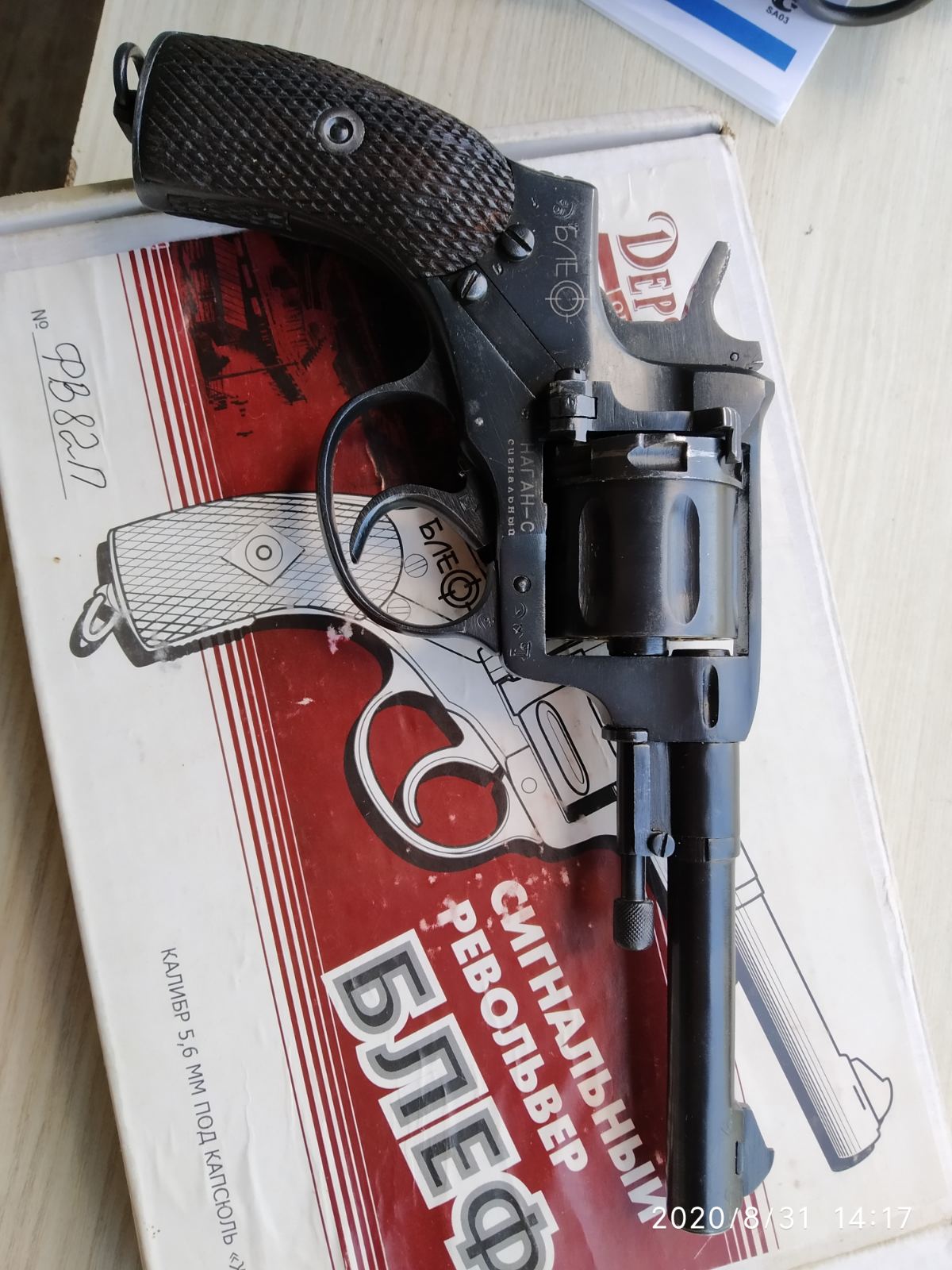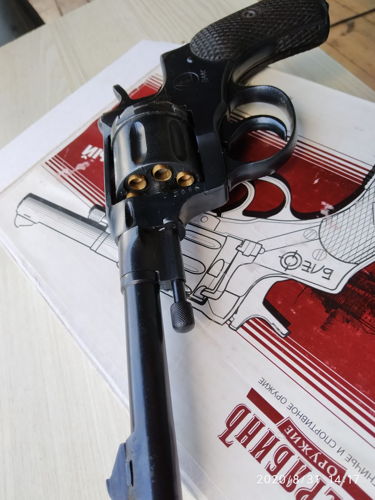 Сток, не шлиф., хорошая геометрия, накладки по году, ижевский. Все детали на треугольниках. Имитаторы патронов на магнитах. Деактив старый - продувается. Абсолютно синхронный. Дополнительный тульский казенник для модернизации под хилти. Кобура с протиркой. Паспорт. Коробка, оригинальный кулек.