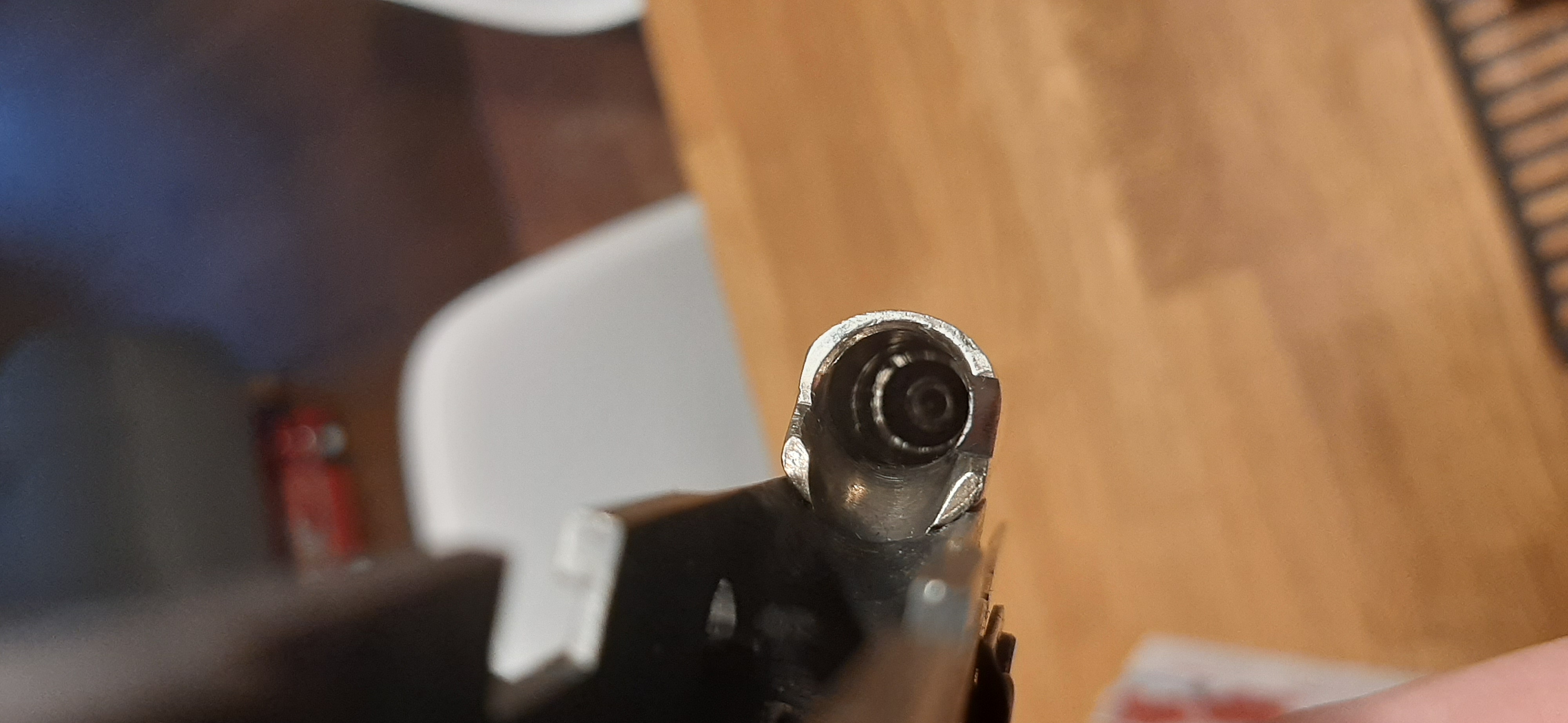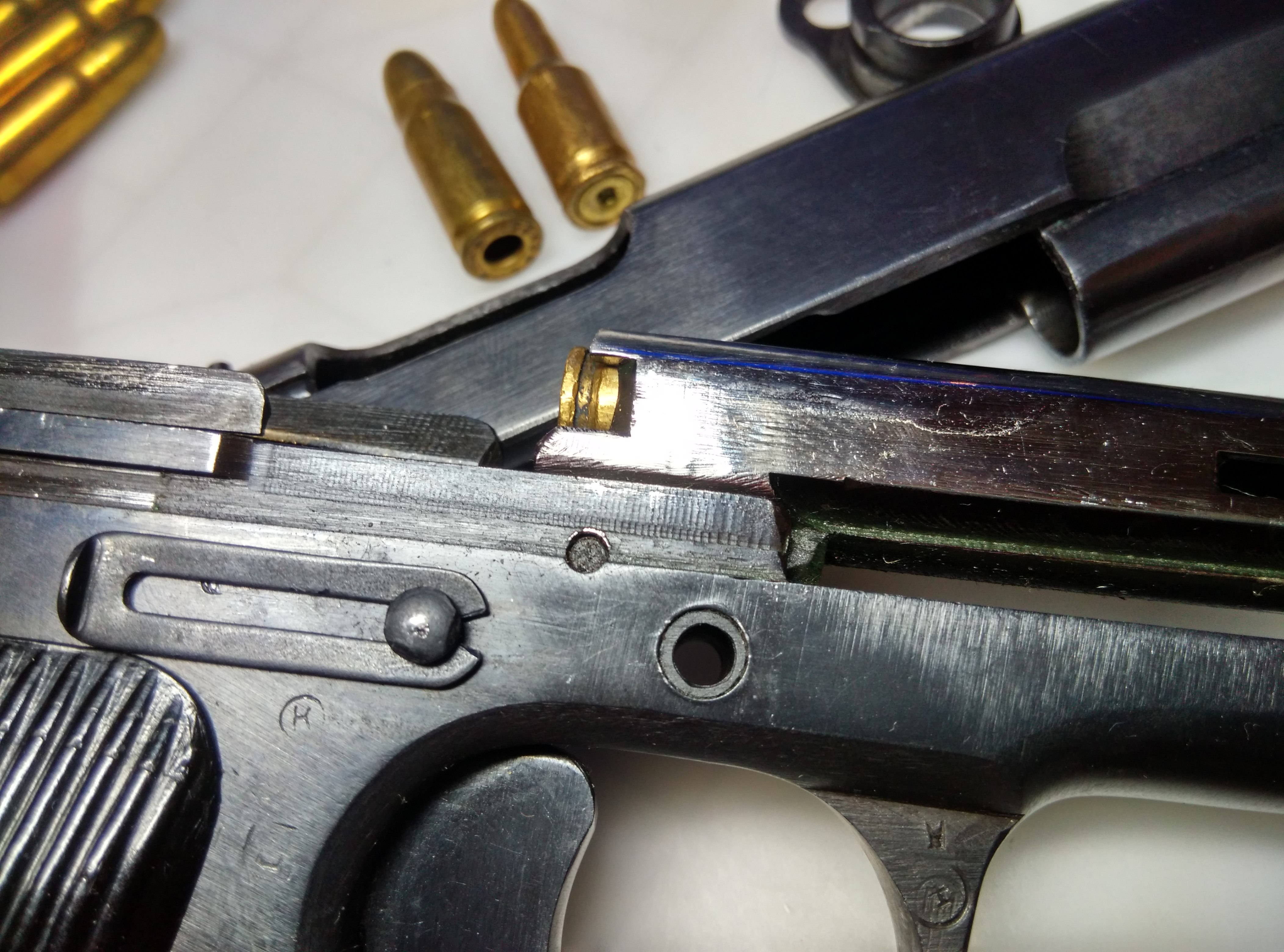 По, ходу, не много не так! Ствол ТТ-С - болванка, не проходная!!! Отверстия сквозного нет! Из патронника есть маленькая дырочка внутрь кожуха затвора, куда и летят все газы и сажа от капсуля. У меня макет ТТ-го патрона не заходит в патронник! :uch_tiv: :dr_ink: :gar_mo:nist: :ko_re:sha: