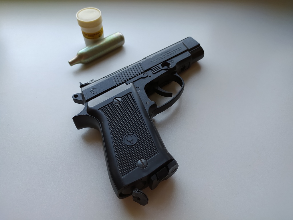 Пистолет исправен, в хорошем состоянии. В комплекте оригинальный кейс, баночка родных вв, целый баллон тех времен и поясная тканевая кобура. Паспорта нет.