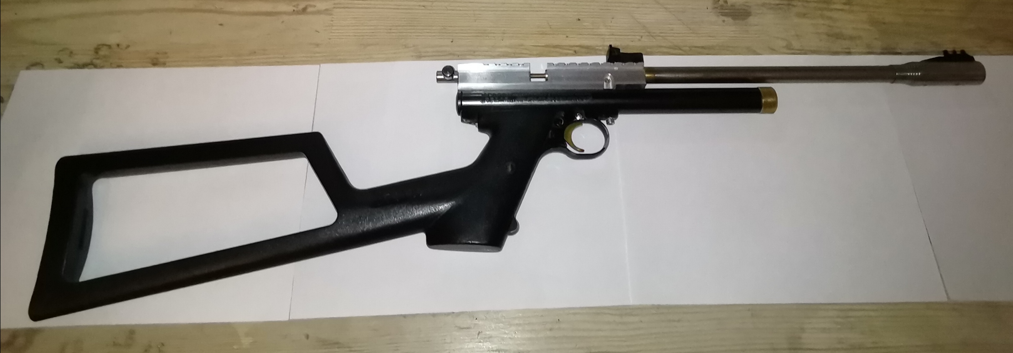 Кислотник, дудка 4и5 CZ (донор Slavia 630), труба и клапанная группа Crosman 2250B, питание как от 12гр баллончика, так и напрямую через пробку с "квиком" в трубу-резервуар (клапан улучшен и дополнительно уплотнен в трубе кольцом), уплотнение досылателя выполнено в стволе, марадеробарабан становится четко (но его не будет, впрочем как и предохранителя).