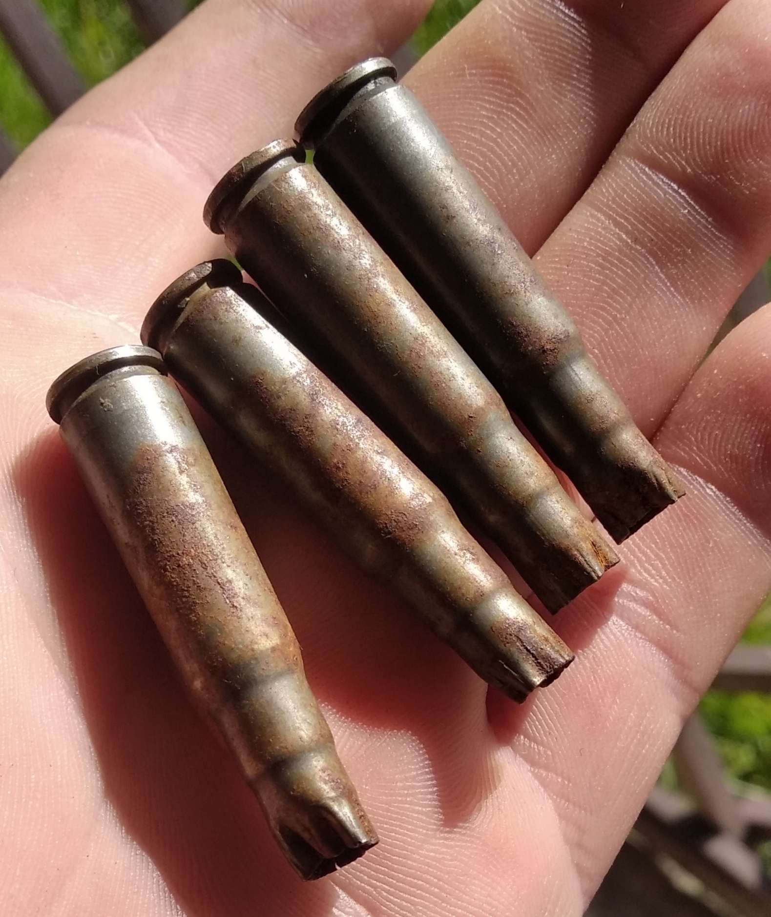 Сгонял в лес, там в феврале реконструкция была. Нашёл только 4 шт, и то ржавые. Это 7.62-39 холостые. МГ42 ими стрелял.