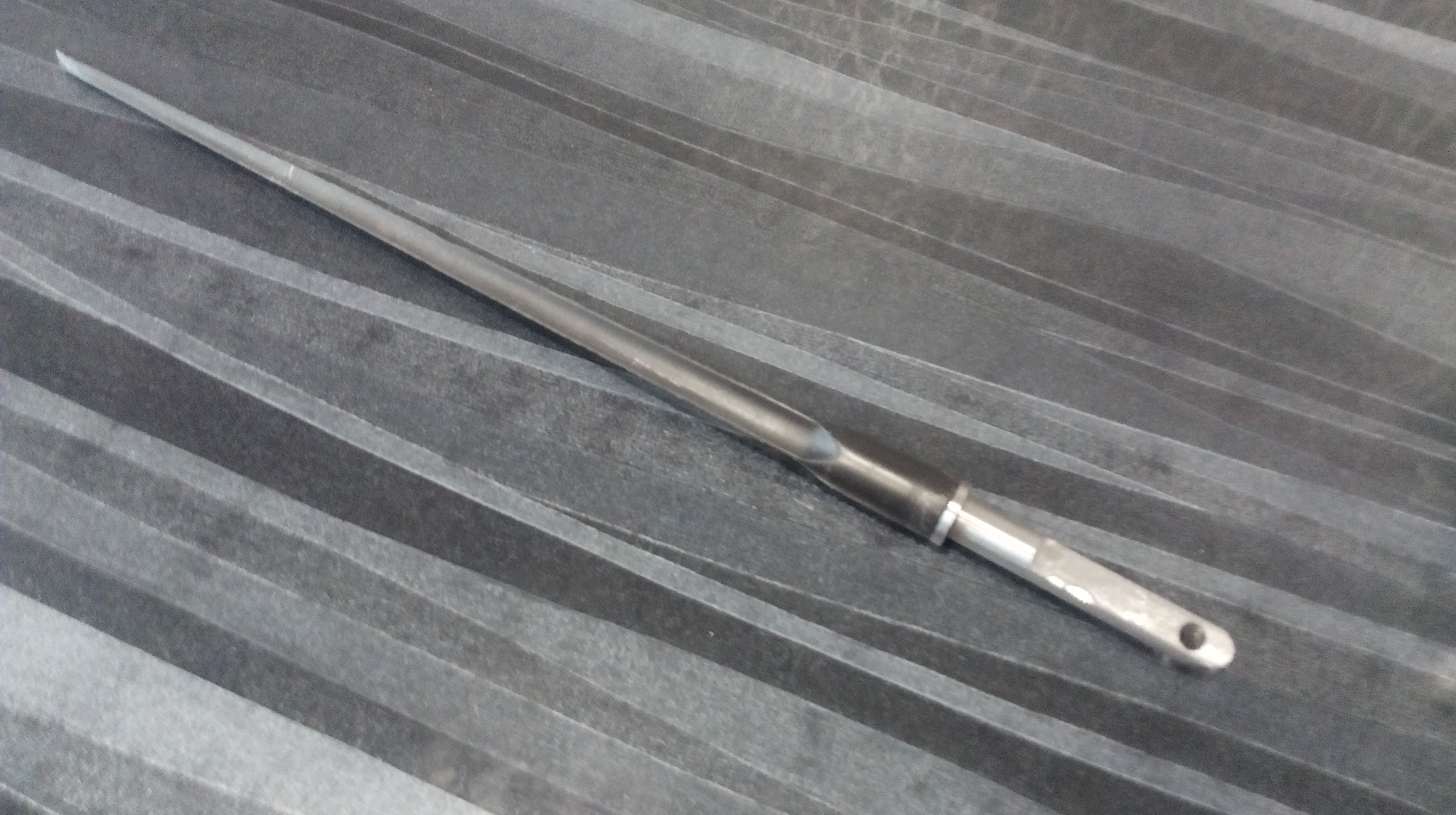 Кусок нужный отпилил,благо в пике по центру была полость изначально-как раз здорово шпилька туда вкручивалась. И метчики не надо-самой шпилькой которую прокручивал пассатижами и нарезал резьбу в пике. Обезжирил всё и неспешно добавляя приготовленный ЭДП на шпильку вкрутил сначала в задний кусок штыка(с хвостовиком кусок),а после обильно забив клеем второй кусок накрутил и его по резьбе. Итог-монолитный слегка потяжелевший штык который теперь хренушки зломишь! Напиханный клей ЭДП в пику не выталкивал со шпильки соприкасаемые половинки-скручено мёртво. После высыхания будто булава Ильюши Муромского стал штык-не гнётся даже при желании!!! Зачистил аккуратно стык склеенных кусков. Ну и решил достойно перекрасить штычок в более соответствующий колер. Хотелось чтобы на воронёный смахивал в тон всему железу. И сегодня в ночную смену полаботрясничал пока мой вучань(стажёр) постигал азы моего мастерства. А начали именно с азов-уборка линии, замена мусорного мешка,утилизация через край уже забитого..... Ну в общем писанное правило-ДЕДУШКА ВСЕГДА ПРАВ!!! :-)