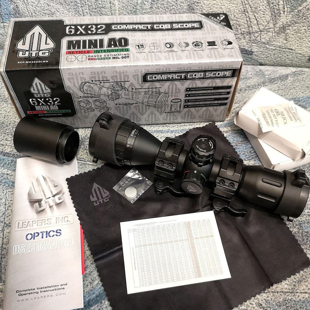 Оптический прицел UTG Leapers 6x32 Mini (AO, Подсветка, Mil Dot, 25,4мм) [SCP-M632AOLWQ] – компактный прицел с постоянным увеличением изображения 6Х. Прицел из серии UTG Leapers Bug Buster имеет маховик отстройки от параллакса на объективе диаметром 32 мм, обеспечивающий точное попадание в цель на очень малых расстояниях от 2,7 метров (от 3 ярдов до бесконечности). UTG Leapers 6x32 Mini с прорезиненным корпусом и платформой TS (True Strength) предназначен для использования на мощном оружии с большой энергией отдачи. Прецизионные маховики поправок с рифленой поверхностью и фиксацией пристрелочного нуля смещают центр сетки Mil-dot на 1/4MOA за один щелчок. На прицельной сетке Mil Dot нанесено по 9 точек в каждом направлении. Для наблюдения в условиях недостаточной освещенности предусмотрена красная/зеленая подсветка, регулировка плавная. Прицел изготовлен на станке с ЧПУ из алюминия повышенной жесткости, имеет корпусную трубку, герметично заполненную азотом, что делает его ударо- и водостойким, универсальным – можно стрелять в любых климатических условиях. Многослойное покрытие линз оптимизирует светопропускание и делает изображение четким и ярким. Диоптрийная коррекция +/- 3 D. В комплекте среднепрофильные кольца RQ2W1156 Weaver (Picatinny) с рычажным зажимом, быстросъемные, антибликовая бленда 60 мм и откидные крышки flip-open.