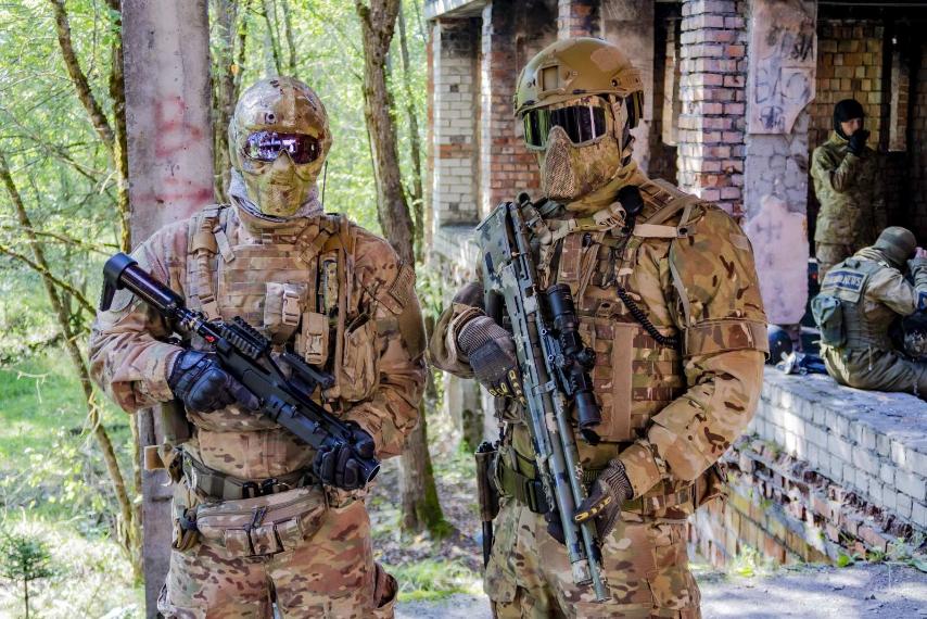 мощные баллистические очки, правильная вентиляция (никакого запотевания), удобны для прицеливания в оптику, из стекловолокна. в однин из них встроены камера, сенсорное управление, фонарик (красный). но это удел богатых)
