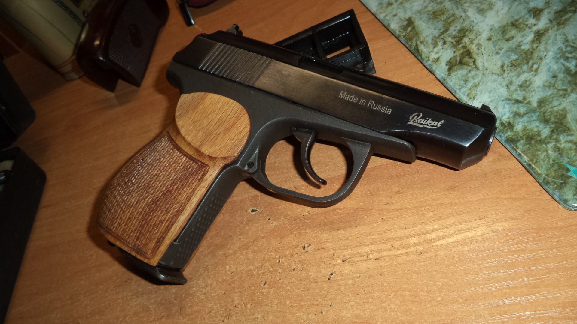 Бакелит продан. Пистолет в стоке с деревянной рукоятью 210 ( красный курок , красная тяга, потайной болт , с антабкой в придачу, переходник для запуска ракет). Пересыл .