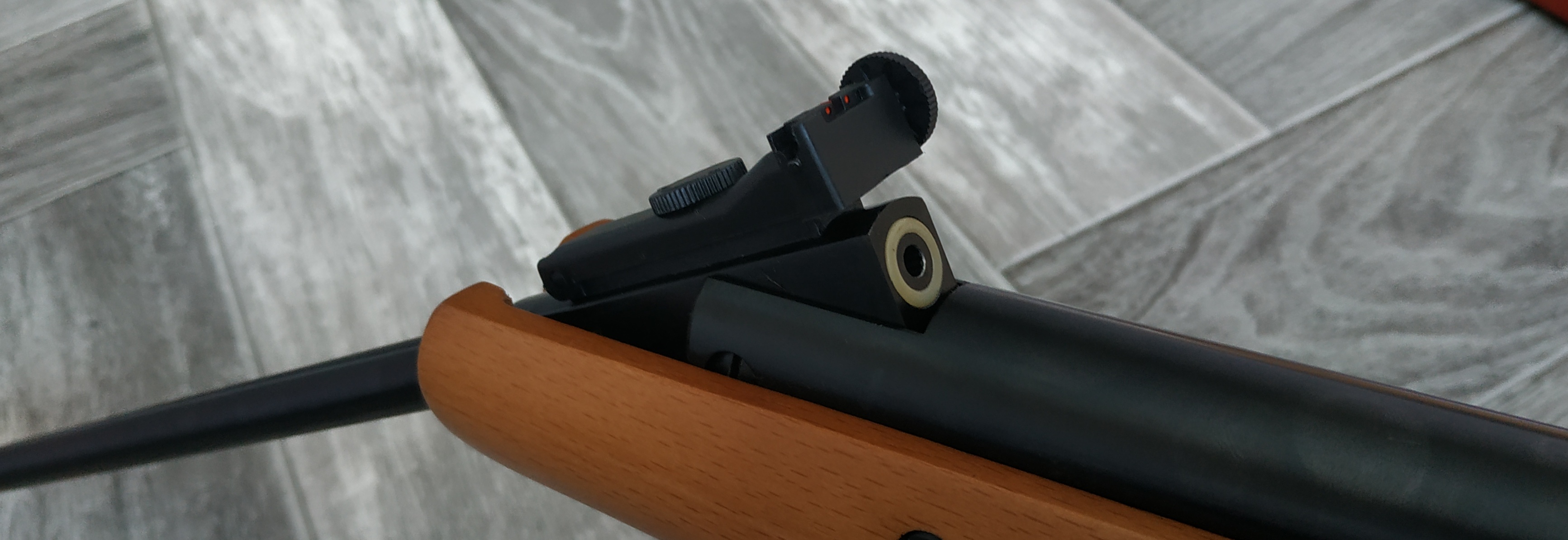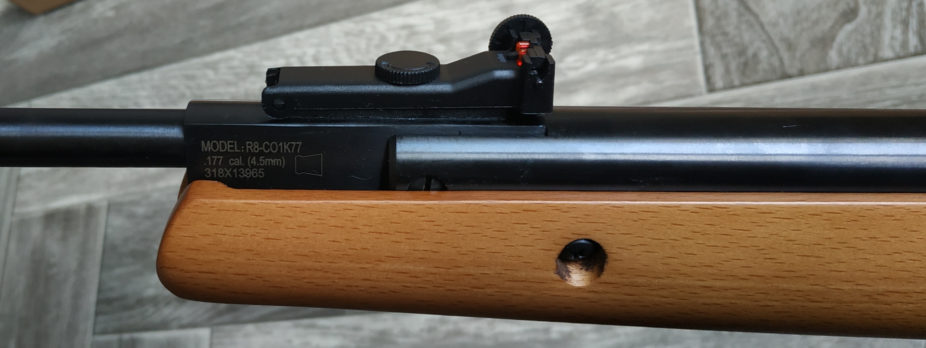 Деревянное ложе, металлическая муфта, легкий взвод, хороший спуск, предохранитель не автоматический, открытые прицельные, есть "ласточкин хвост" для установки оптики