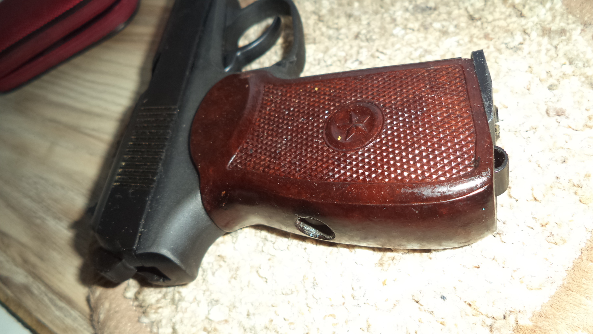 32й практически новый, отстрелян один баллон. Подогнана рукоятка от боевого списанного ПМ. Черная родная в придачу. Комплект стандартный , пистолет , коробка , документы , инструкция, ключик, ремкомплект. Цена 350р. Сморгонь. 80336863322.