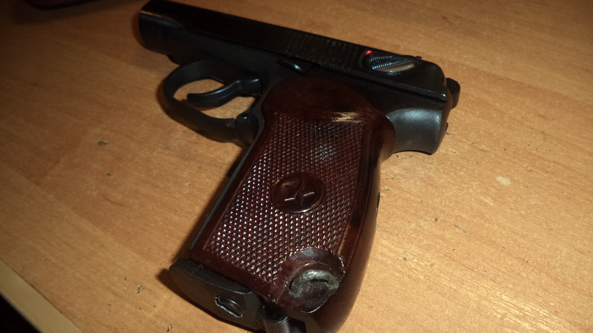 32й практически новый, отстрелян один баллон. Подогнана рукоятка от боевого списанного ПМ. Черная родная в придачу. Комплект стандартный , пистолет , коробка , документы , инструкция, ключик, ремкомплект. Цена 350р. Сморгонь. 80336863322.