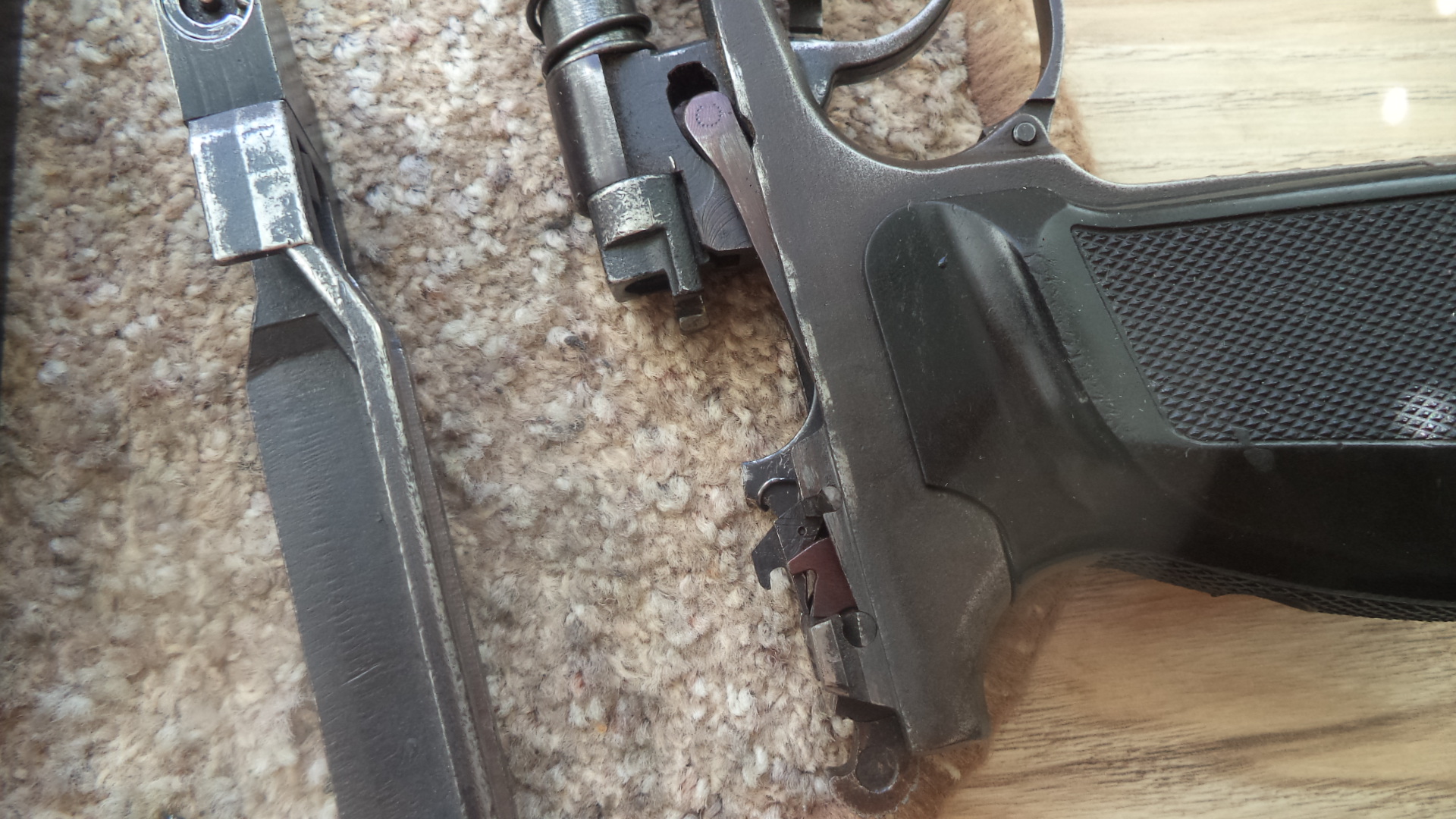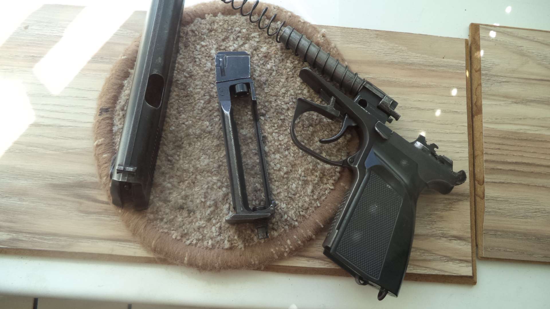 Продам МР654К 300р. Образца самых первых выпусков 1998 г. Борода малая, все надписи присутствуют, гайка и голова магазина с зацепом, антиблик полуширокий, магазин с болтиком поджима баллона имеет антабку ( зажимать баллон можно без ключа) , клапан первого выпуска утоплен в голову магазина , курок с четырьмя насечками. стволик длинный без проточки,тяга и шептало красные ,рукоятка от ПММ с болтиком от его же, установлена фторопластовая прокладка ствола. Могу установить деревянную рукоять , будет немного дороже. Состояние соответствует годам , все таки 25 лет. Потерт хорошо. Все вопросы по телефону 80336863322. Полностью исправен.