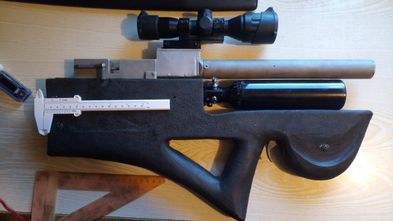 Самоделка-полуфабрикат в 4,5 мм на основе 79 кубика с колбой на 0,22 литра с редуктором, многозарядной рычажной коробкой, неплохим стволиком 250 мм в ложе средней паршивости общей длинной 52 см:)
