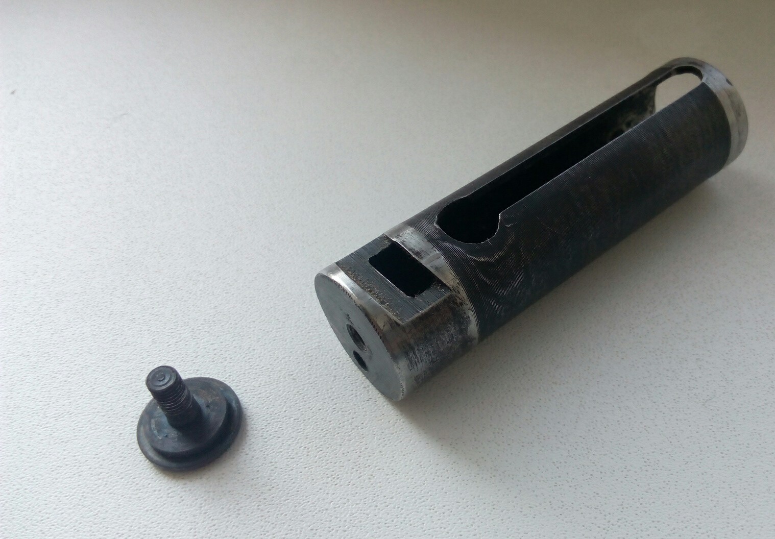 Состояние поршня бодрое. К нему тебе нашёл тот самый переходник/грибок под иные манжеты. Лишь чуть надо его доработать-длинная ножка резьбовая,надо обрезать 5мм. Тогда всё будет "как бабушка просила". К поршню и грибку положу тебе на пробу полиуретановую манжетку. У меня в 2-х "Мурках" такие ходят и меня удовлетворяет всё. Не понравится или что-то не устроит-поставишь свою ВАДОвскую.