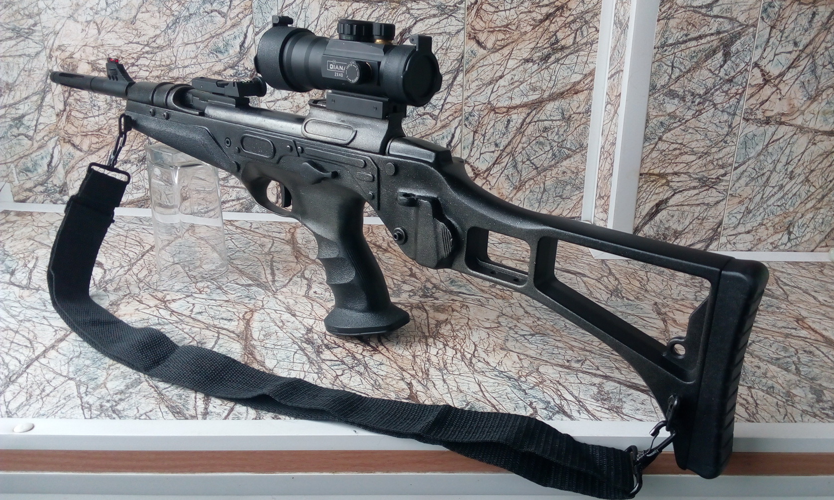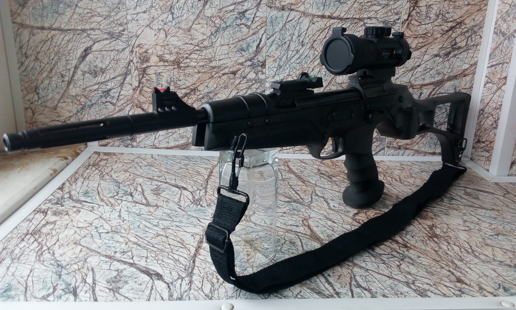 В итоге выходит такой вариант. Владелец доволен вроде и "кулямётом" и прицельными приспособами. Оптику пока не рассматривает-хватает и открытых прицельных и данного коллиматора. Вариант с новым коллиматором: