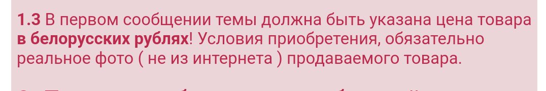 1.3 В первом сообщении темы должна быть указана цена товара в белорусских рублях! Условия приобретения, обязательно реальное фото ( не из интернета ) продаваемого товара.