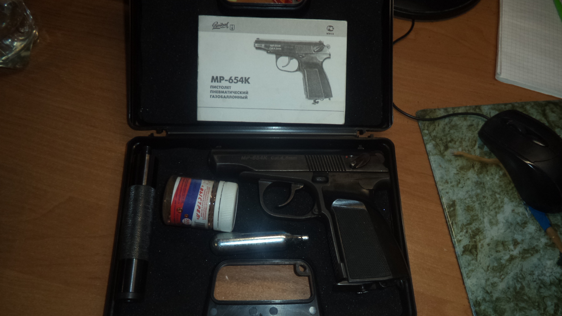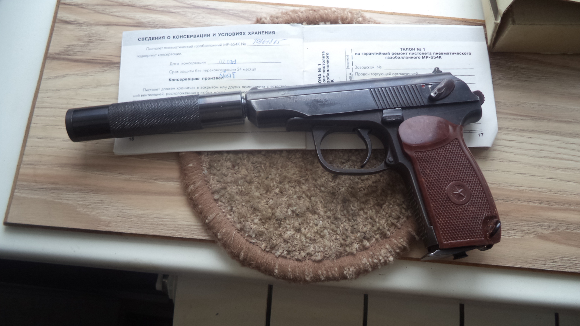 Продам МР654К03. 400р. Состояние хорошее. Сделано очень много. Установлен гладкий ствол с удлинителем , прокладка ствола ,красный курок, красная тяга,дутая ЗЗ , бакелитовая рукоятка, в магазин установлен потайной винт, направляющая втулка для шаров, болтик центровки шарика , болт крепления рукоятки от ПМ. В комплекте - коробка, документы, пистолет , глушитель, шарики, баллончик. Все вопросы по номеру 80336863322 (вайбер) Могу установить рукоятку от ПММ. (черный бакелит с каркасом внутри).