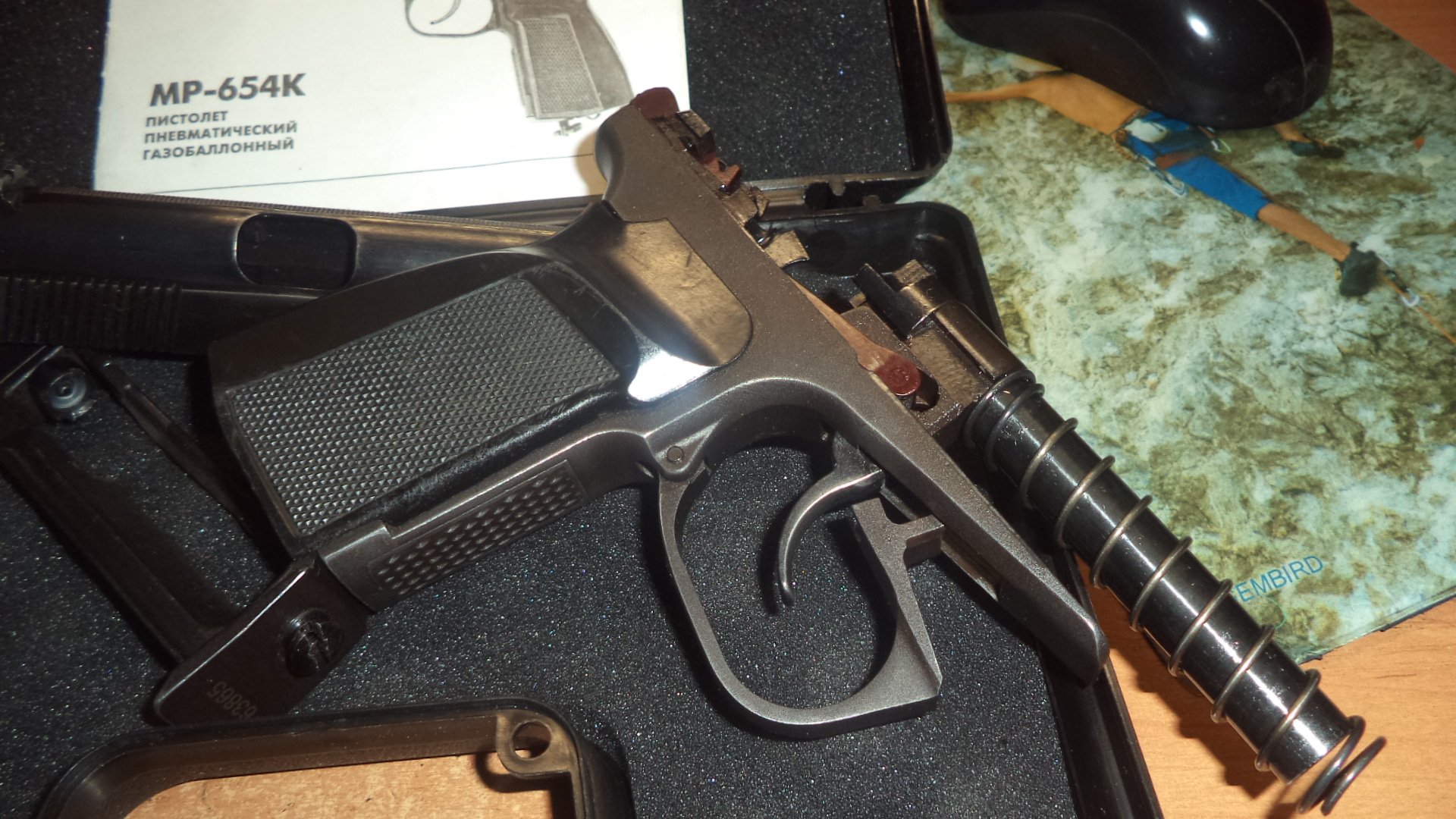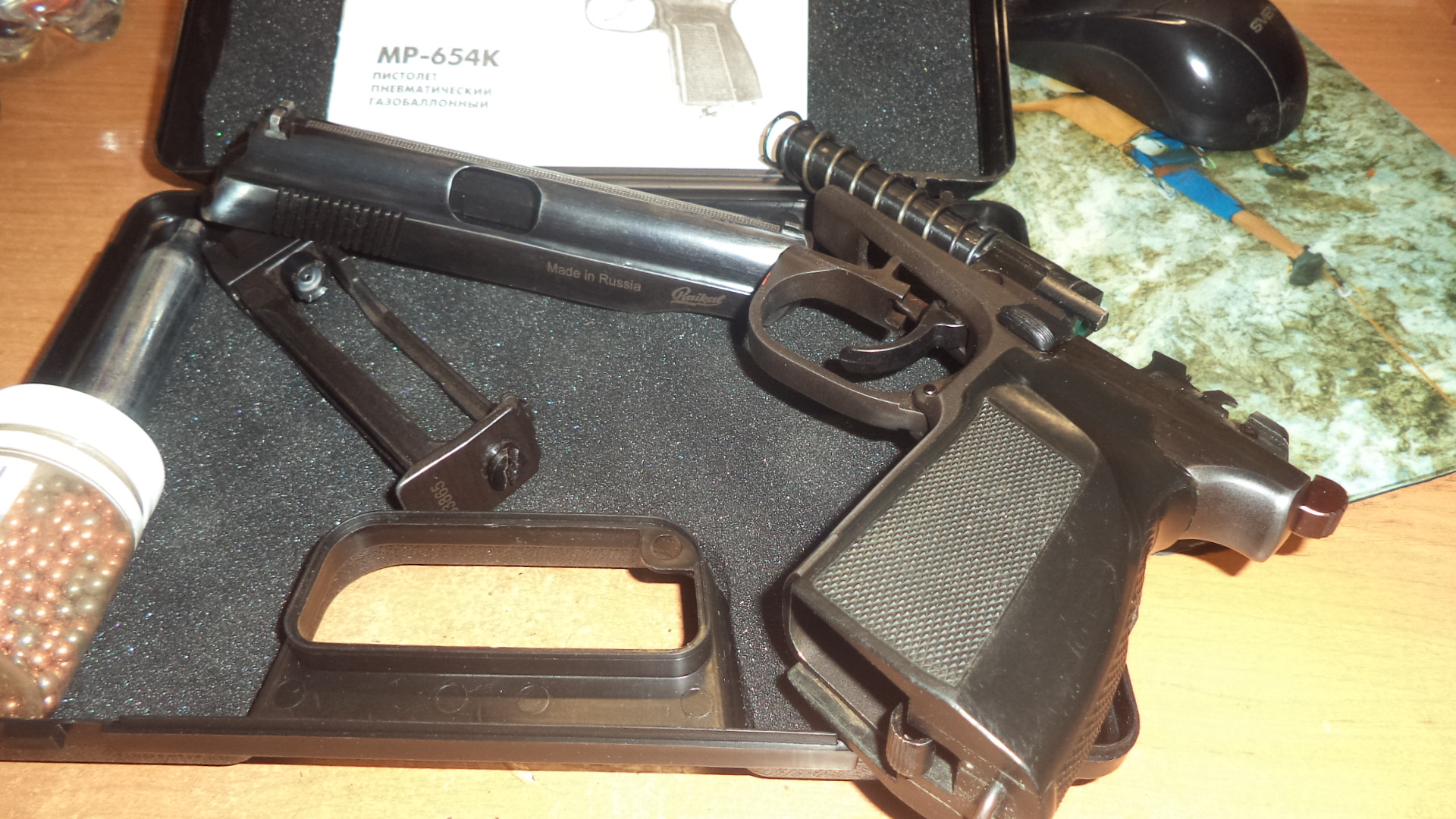 Продам МР654К03. 300р. Состояние хорошее. Установлен гладкий ствол , прокладка ствола ,красный курок, красная тяга,дутая ЗЗ , в магазин установлен потайной винт, направляющая втулка для шаров, болтик центровки шарика , болт крепления рукоятки от ПМ. В комплекте - коробка, документы, пистолет , шарики, баллончик. Все вопросы по номеру 80336863322 (вайбер) Рукоятка от ПММ. (черный бакелит с каркасом внутри). ВОЗМОЖЕН ОБМЕН. Без дутой ЗЗ 280р.