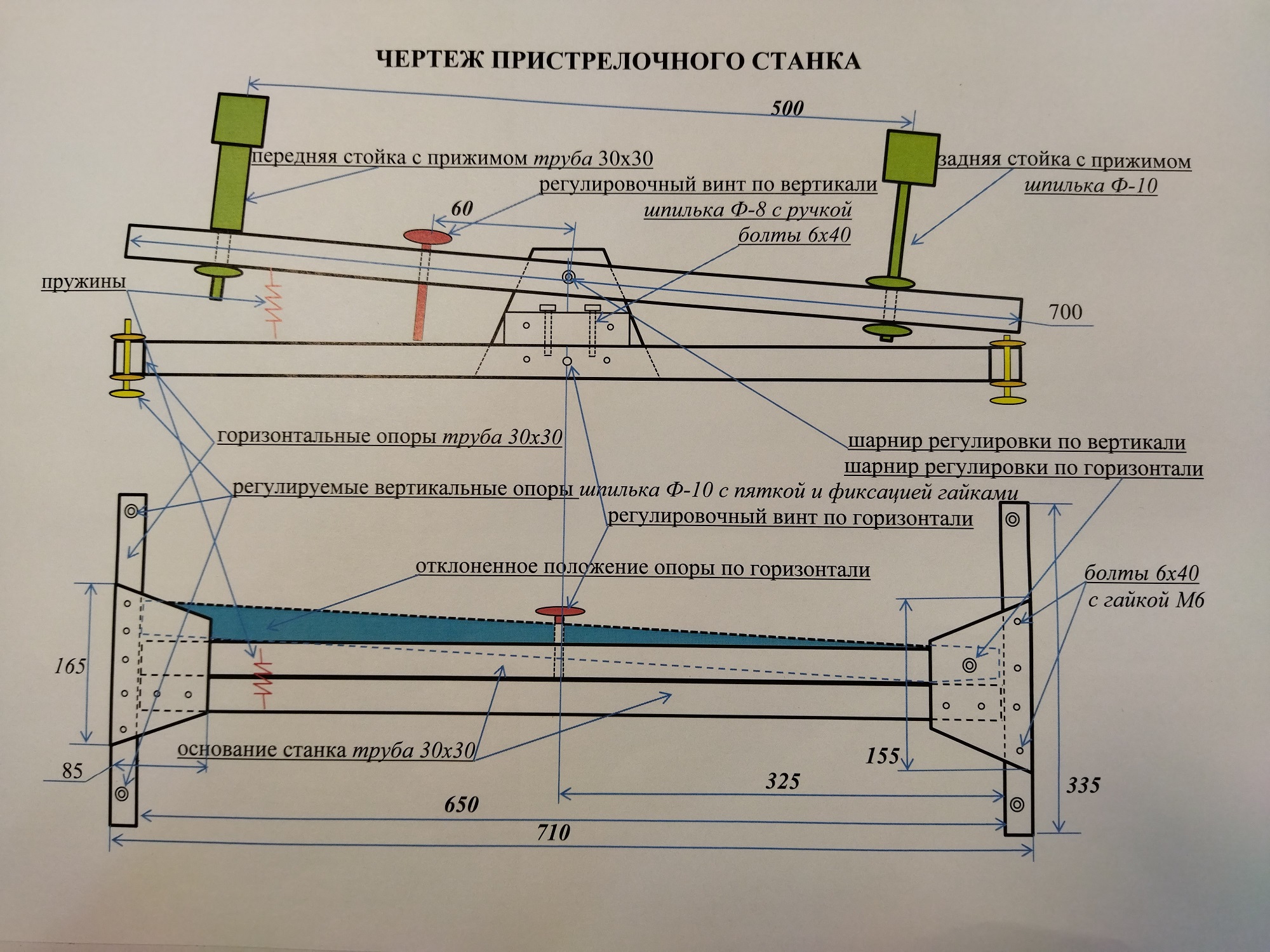 Материал выбран – профильная труба 30х30х2,0 мм. Чтобы не крутить гайки ключами, для регулировки вертикальных опор использованы «проходные барашки» с гайкой М10, болты L-120мм., к головкам которых прикручена винтом М4 сама опора.