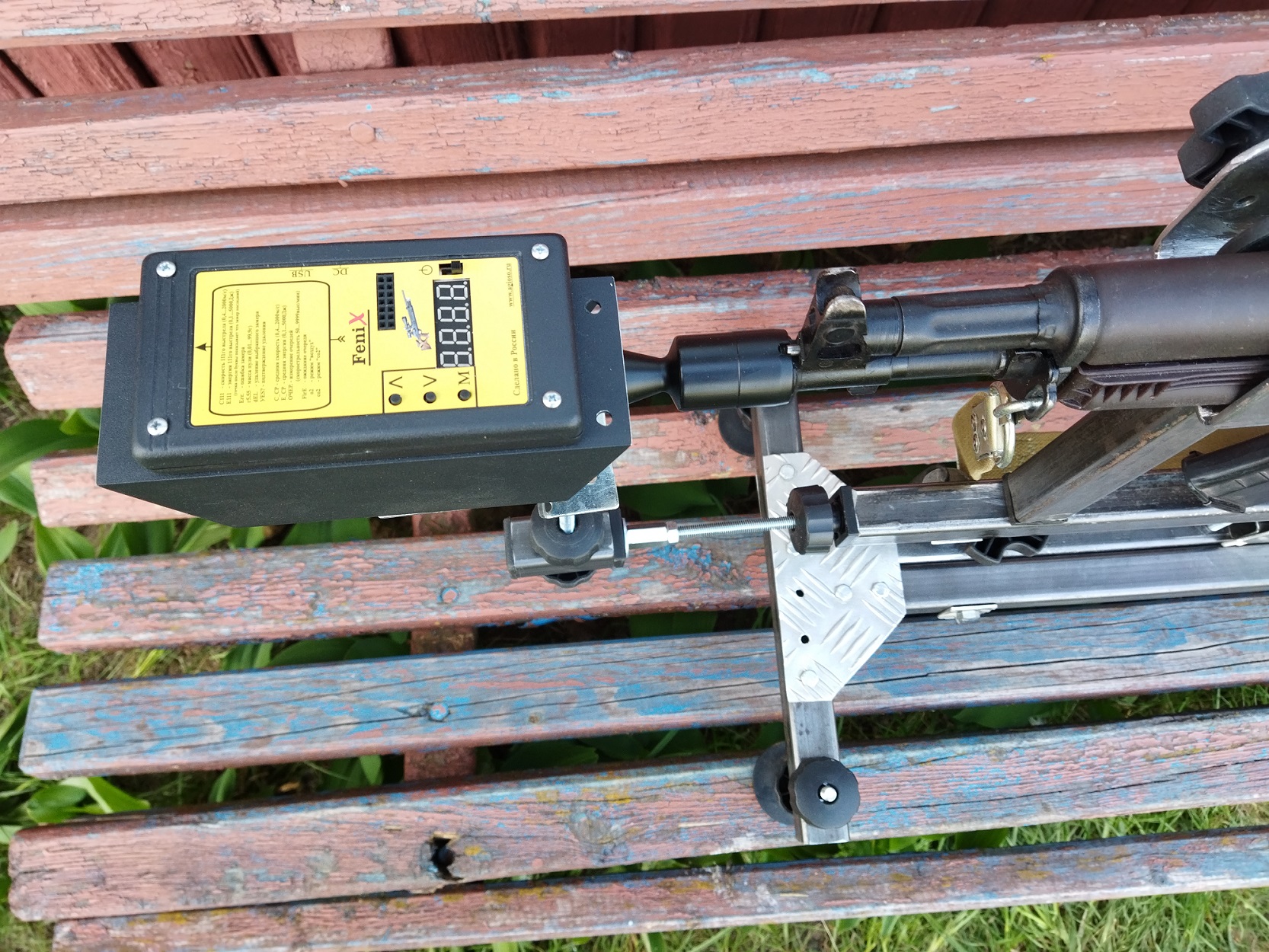 Узел крепления хронографа выполнен из той же торцевой заглушки с гайкой М8. Шпилька вкручена и зафиксирована в отрезке трубы. Трубка имеет перпендикулярное сквозное отверстие Д=8мм. для крепления и регулировки по нужной высоте держателя хронографа. Второй конец шпильки вкручивается в заглушку балки до требуемого расстояния по выносу до среза хронографа.