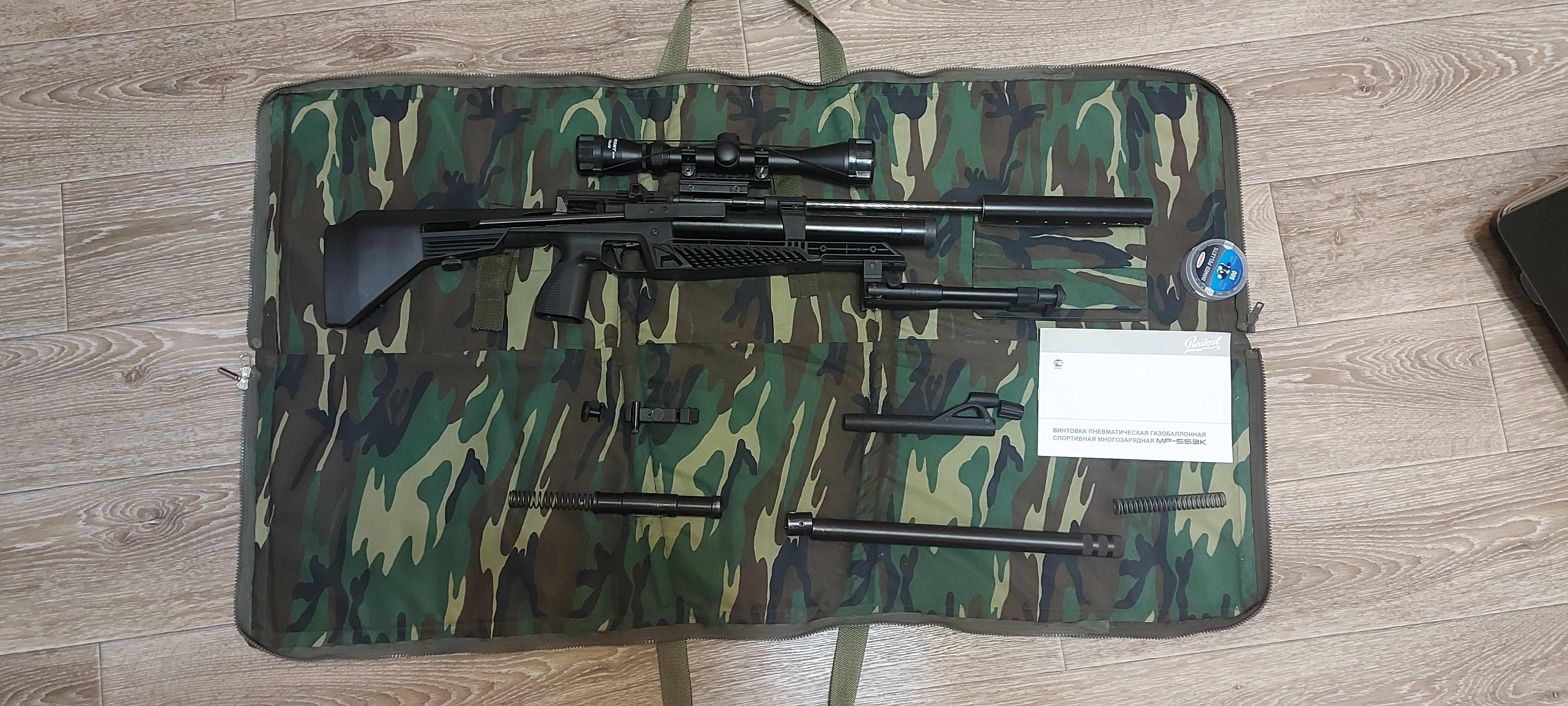 Комплект — всё включено, всё что на фото. Сама винтовка, два магазина, заправочный квик, оптика svbony sv120 3-9×40, модер, сошки, документы, чехол, стоковая клапанная и ударная группы под со2, полбанки пуль 0.68г.