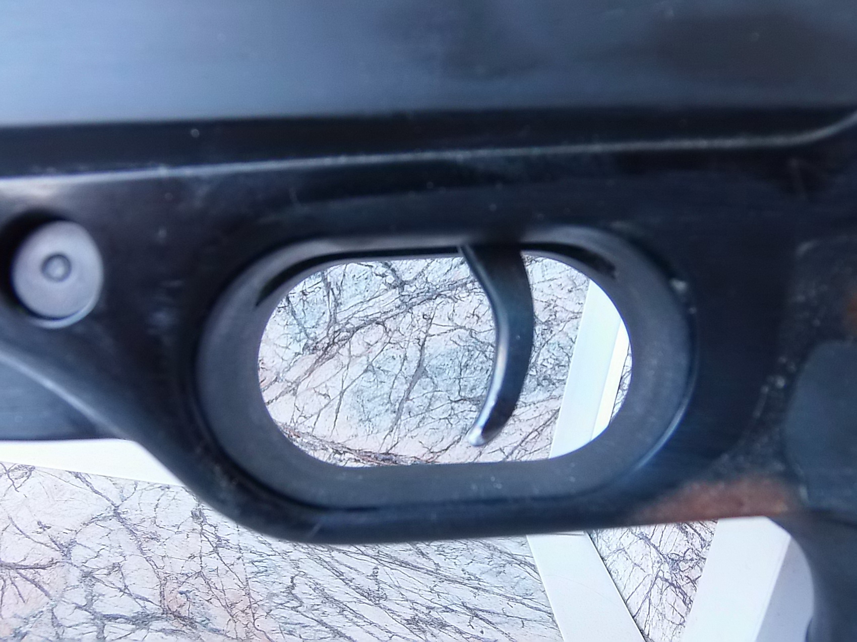 Когда всё высохло, поглядел сбоку на полученный результат и не понравилась мне пустотка, разрыв между патронным магазином и спусковой скобой. За магазином в 5мм располагалось отверстие с втулкой для заднего крепежа компрессора. Решил сделать этакую колодку под экстрактор магазина и этой «колодкой» скрыть его от глаз. Нашлась подходящая пластиковая деталь,чуть доработал её по геометрии и примерил-здорово!!! Для надёжности решил её притянуть парой-тройкой мелких саморезов-приложил, отметил планируемые отверстия и просверлился насквозь в ложу. Притянул данную деталь на ЭДП тремя саморезами, шляпки их зашпаклевал и обработал стыки и зашпаклёванные шляпки абразивами. Результат мне по душе: