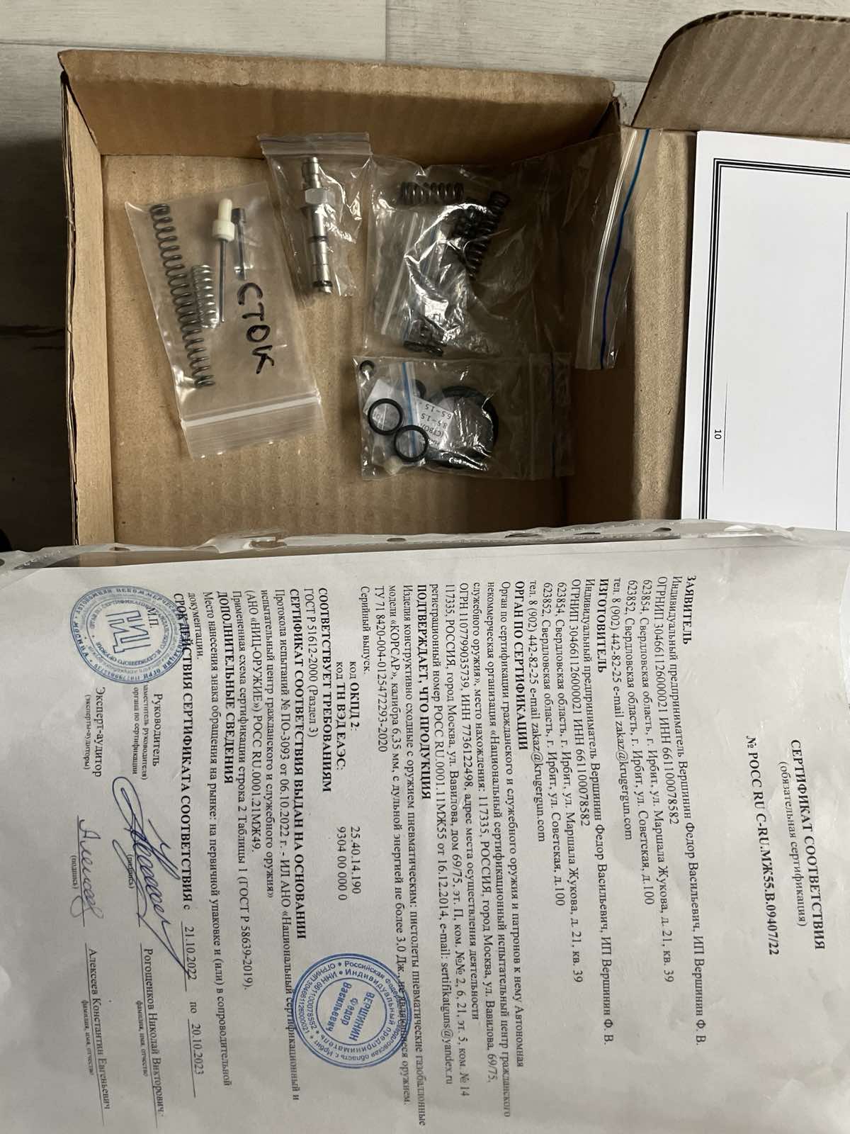 Корсар 6.35, 240 мм ствол, 42-ой резик с манометром, прямоток, выпуск 10.2023, одет в микробулку. Два винта открутить - пистолет.Продается строго в 3Дж. БК, паразитка, пружина БК стоят от Расти, сток в комплекте. Набор пружин от Расти (в ударку, бк, усм) в комплекте. Так же бумажки, РТИ, штуцер. Прицел Ohhunt 3-9х32 с подсветкой, сетка 6 точек на луч, толстая, в ноябре с Озона. Цена 1300 руб. с прицелом, 1100 без. Только Минск, без пересыла.