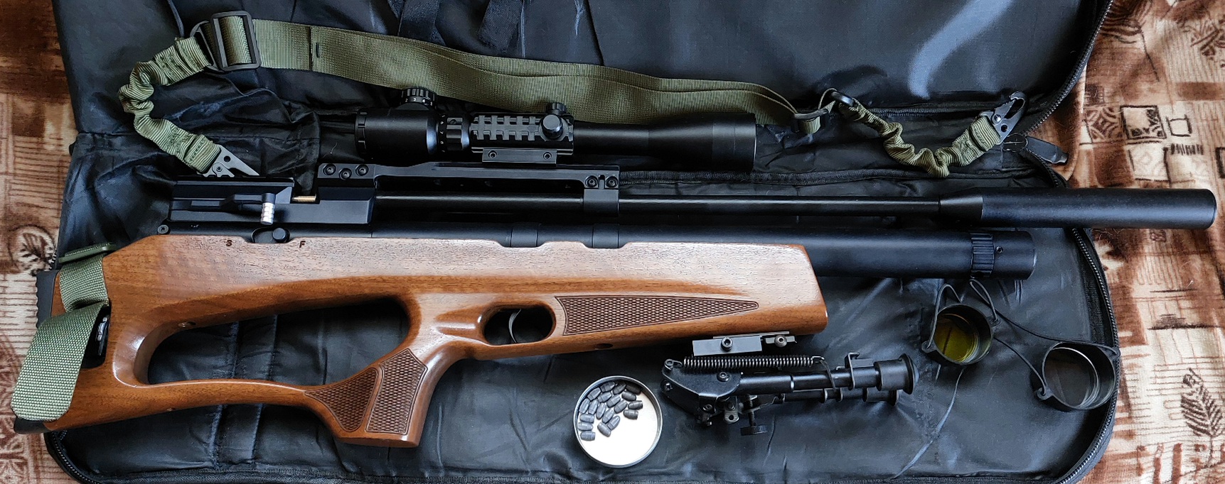 Комплектность: коробка, доки, резинки, штуцер заправочный, само изделие с прицелом 3-9х40(прицельная сетка на фото, с подсветкой), чехол-сумка-рюкзак, ремень с антабками и сошки, 1 барабан (8пилюль с отложкой), немного пелюлек 0,33гр.