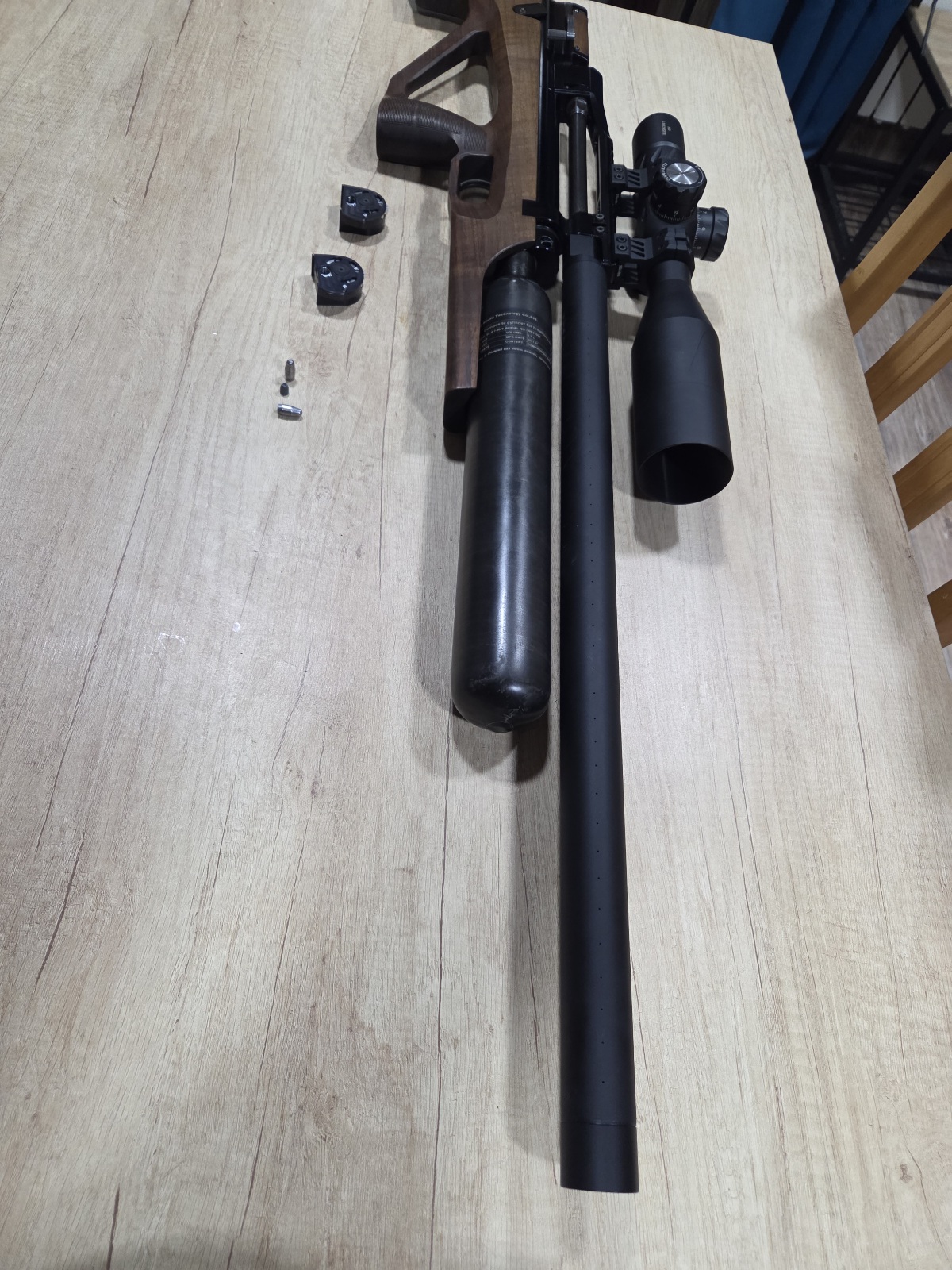 Продам своего Егеря 2022г. bullpup, ствол семерка 700мм., колба 0.7 л., модератор кастом от bizona, ложе отполировано и пропитано дорогими составами, манометр wika, титановый клапан с проходным на 9,2 мм. как и все прохоные до ствола 9мм. заказная боевая пружина на 110мм. ОП Discovery HD 5-30x56sfir gen2. В комплекте два дюралевых автоматических барабана на шесть мест в каждом. Может 12 раз с 240 до 180 бар. припасом 7мг. 300-295 см/мин. Год как уже лежит без дела, просто нет уже времени на это увеличение. Цена 7к byn.