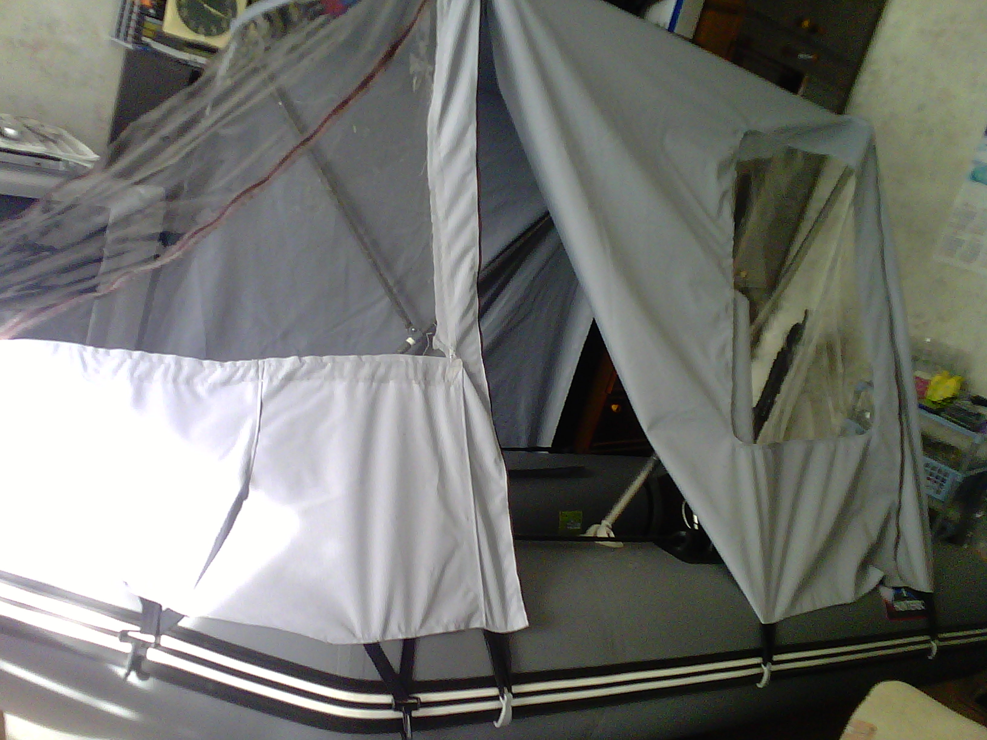 немного продолжения--сегодня закончил одну боковину,осталось второй бок обшить и задний проход,простите ВХОД доделать.молния закончилась,завтра докуплю и продолжу,ну а пока что есть---,на фото ещё нету,но уже добавлена молния для весла,на заводских их не видел,можно грести под тентом.