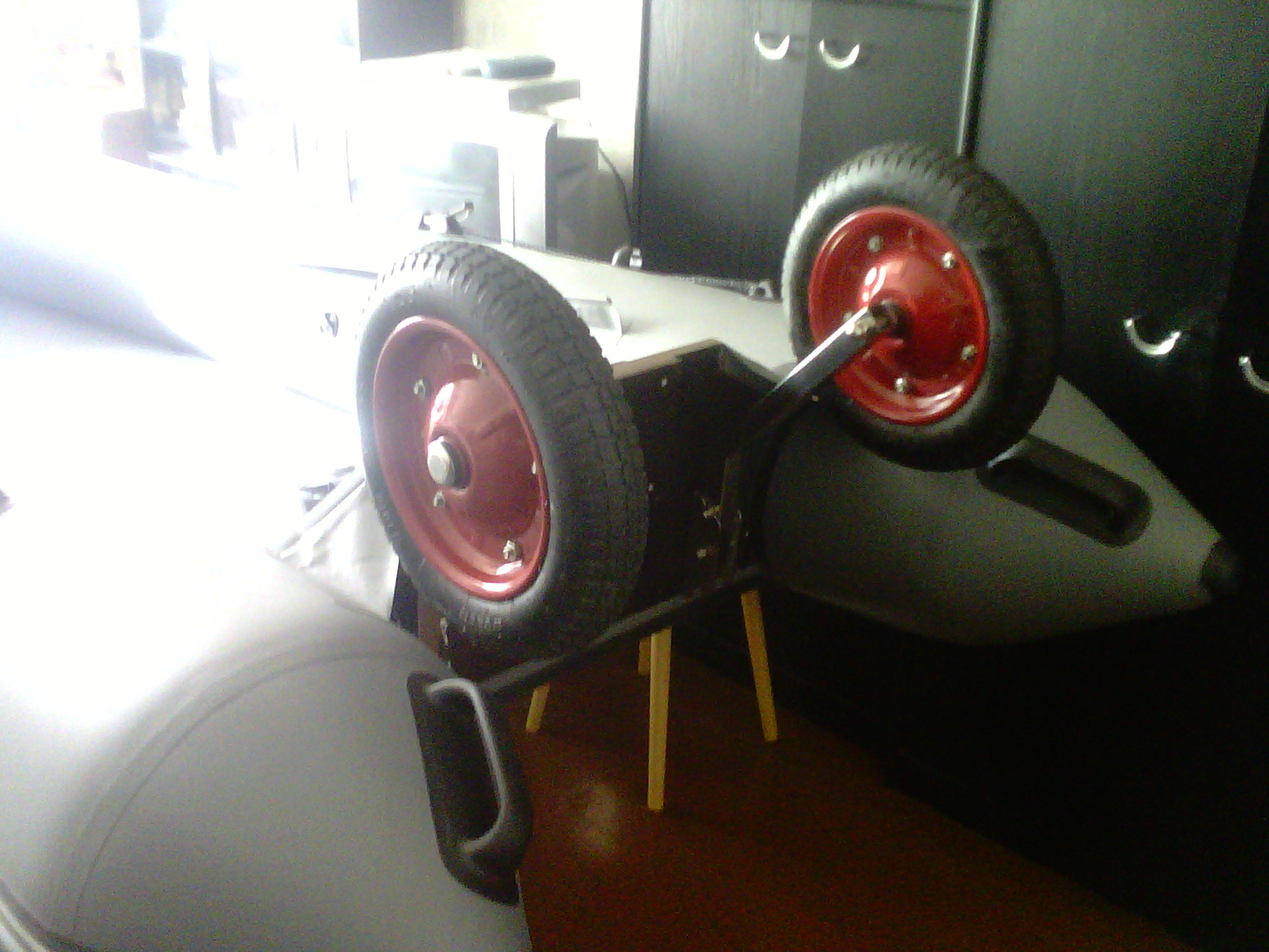 ну вот что имеем на сегодня--(см.фт.)колёса с местного лабаза по 500р за шт.---хрень конечно полная--диски чуть не из кровельного железа--сколько простоят не знаю,но подобного диаметра больше ничего нет,остальные уже от 400мм начинаются,эти на 330мм.подшипники соотв. выкинуты,стоят втулки.счас ещё болты на герметик посажу(на всякий случай) и можно считать её ходовой!