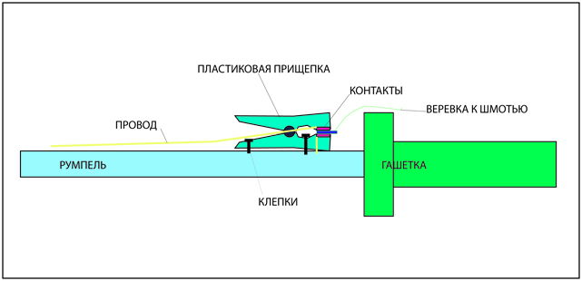 Берется любой штырь из изолирующего материала, к нему крепится шнурок с карабином. А в ответном отверстии для штыря- контакты, которые замыкаются при его вытаскивании. Сделать не трудно. Остальное понятно. Тут только "узкое" место - а если тянуть вбок получится, а не вдоль штыря? Обломится штырь...и тд...