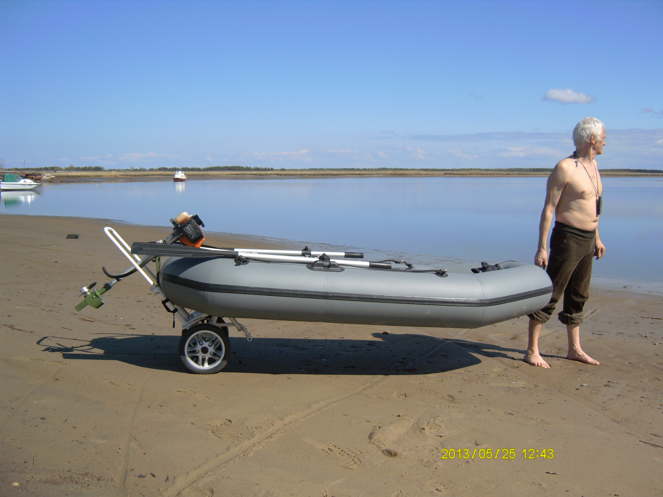 Собрался сегодня на воду, погода устаканилась. Цель была попробовать систему управления и винт регулировать, т. к. поменял зимой шестерни редуктора, передаточное число увеличилось. Система транспортировки ещё в прошлом году делалась. Вот результат, катал прошлый год с километр по сыпучему песку - нормально, не гнёт, не вырывает. Всё ставится на воде за 10 - 15 секунд. Телега располагается перед носом лодки (на воде), места не занимает, и всегда с собой. Весит кг 2. У нас тут пляж, песок метров 100-150, и вот таскать всё от воды неудобно, да и , к тому же день и ночь (пляж всё же) шпана и нтернатовская по берегу бегает, часть шмутья унесёшь, пока ходишь за другой частью, первой может и не быть, где там шпану изловишь! Так что суровая необходимость заставила! :-)