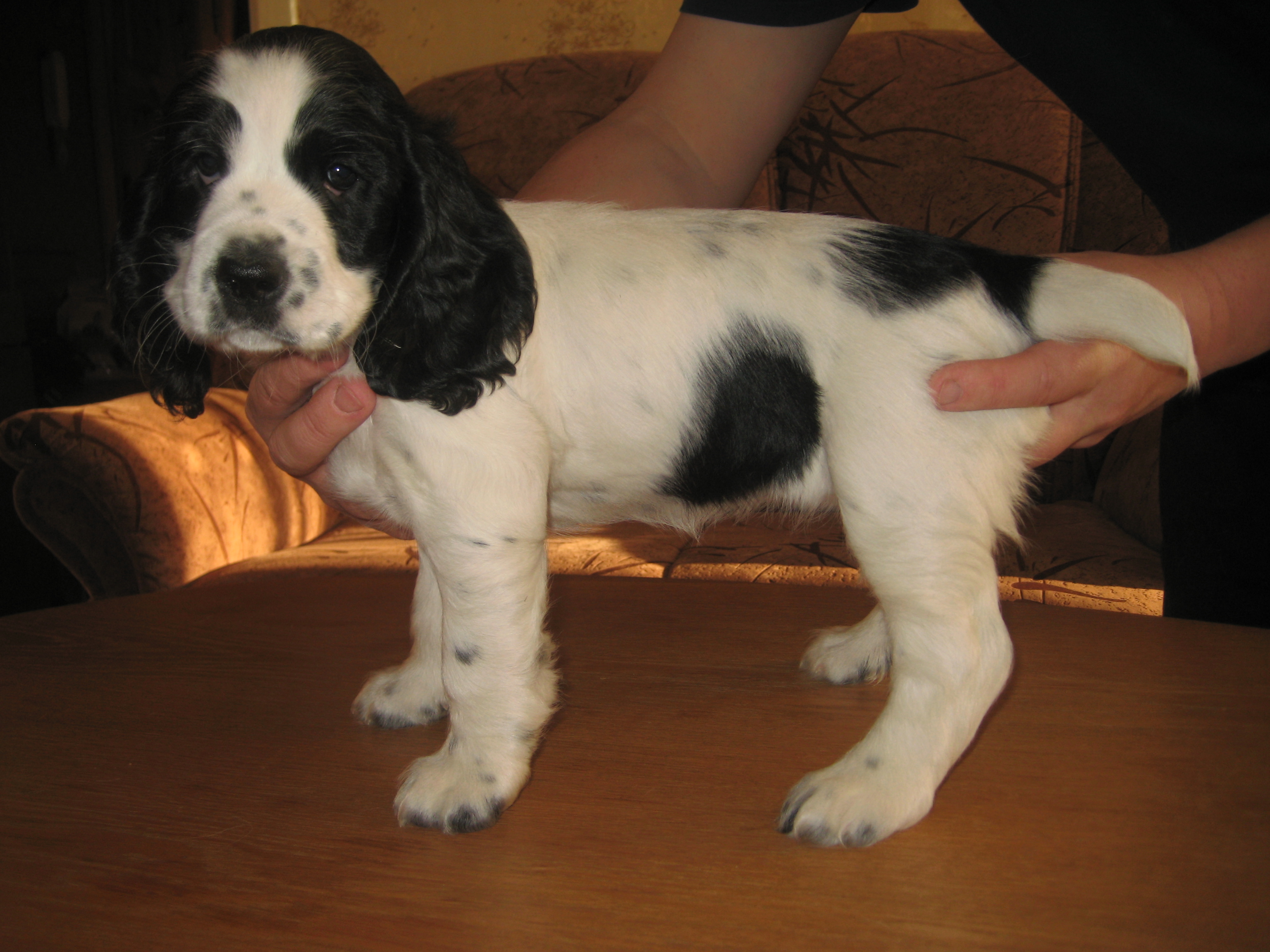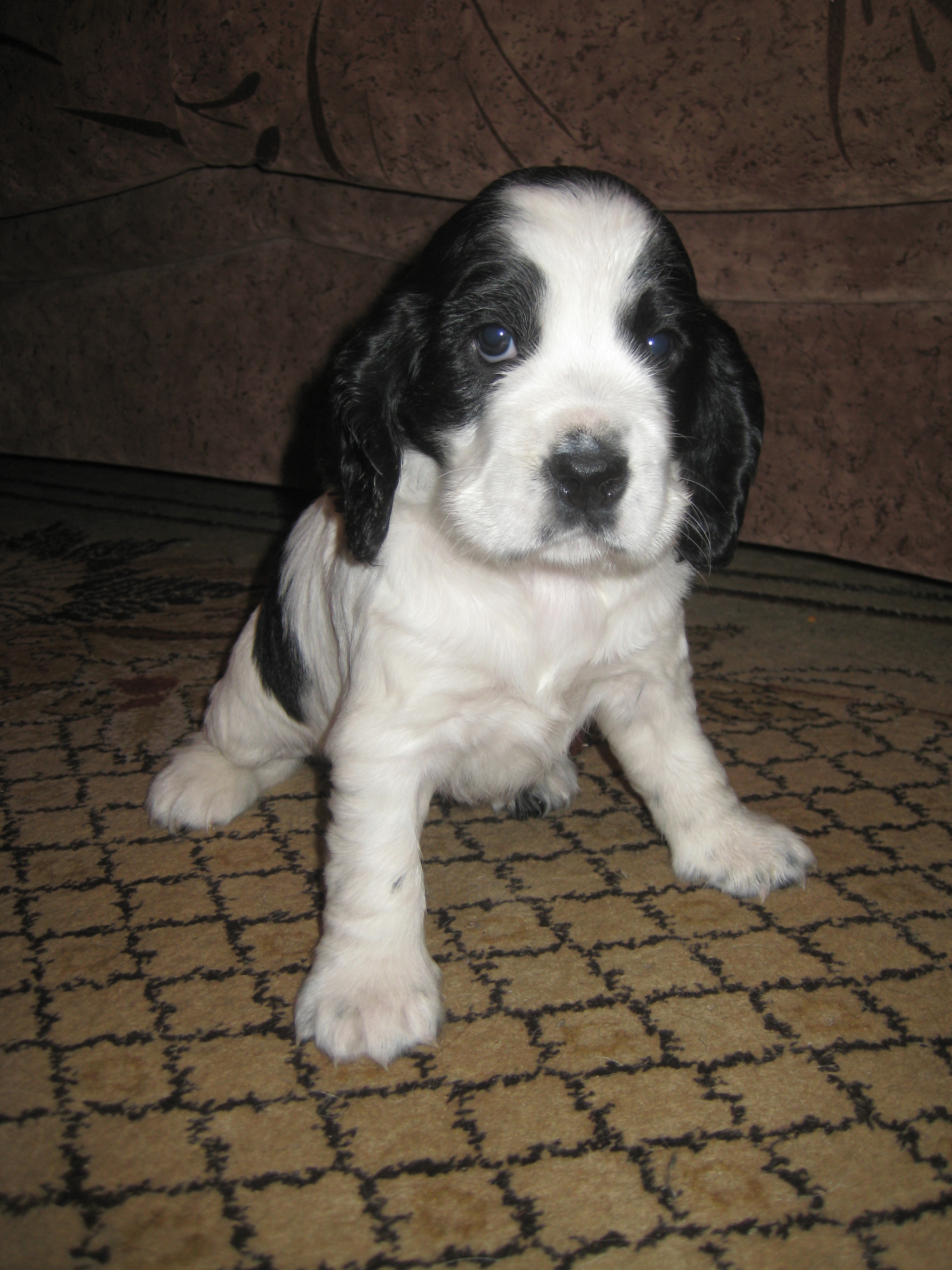 Щенок (сука черно-пегая) русского охотничьего спаниеля (род.23.01.2012) от единственной в РБ пары племенных производителей, имеющих полевые дипломы, племенные классы и отличные родословные.