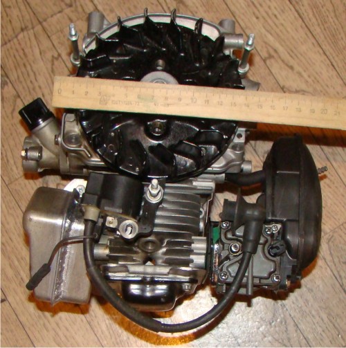 Олег, как раз хотел тебя попросить показать моторчег поближе! А тут ты и сам вызвался :-): Интересует, чито это за коробочка к карбу прилеплена? Маховик -вентилятор, получается сверху, и обдувает цилиндр сверху вниз.. Ты родной поддон от от Хонды не видел, куда потом горячий воздух выдувается, вниз или вбок щели сделаны?