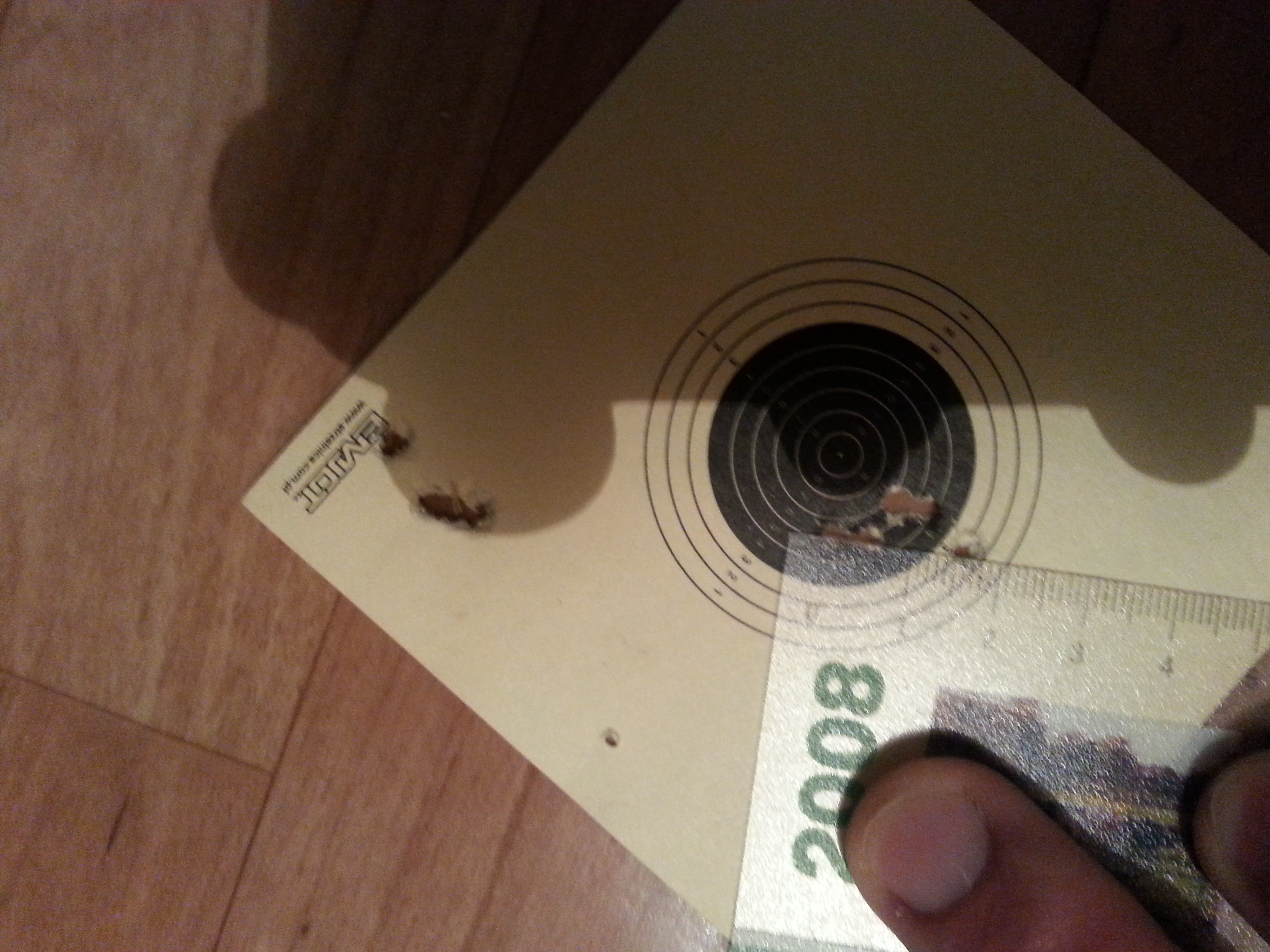 вторая группа 16мм - 5 выстрелов, целился по букве Е вверху, если бы не порыв фронтального ветра, все собрались бы в группу 9мм.
